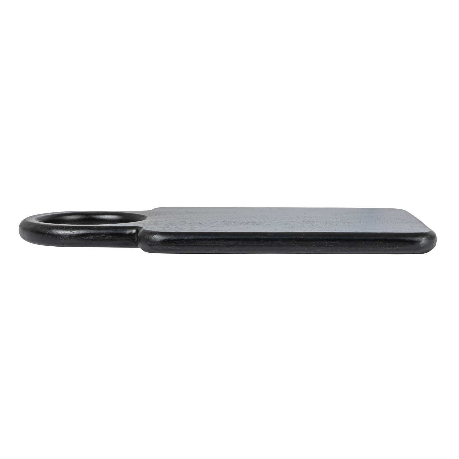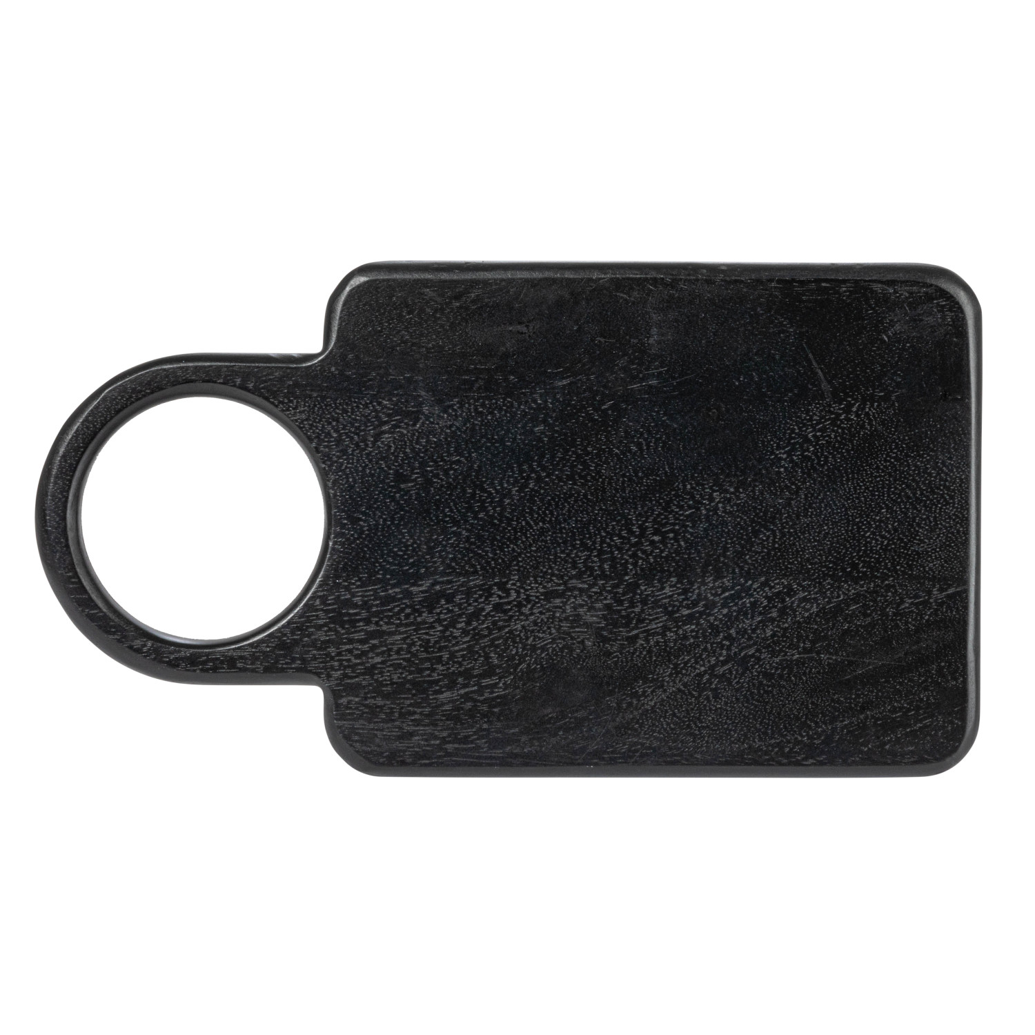 This mango wood cutting board with a round handle is a chic and functional accessory for the kitchen. It features a solid mango wood surface with a smooth and delicate texture and a black finish that creates a sleek and elegant look. The mango wood is also eco-friendly and sturdy, making it an ideal choice for any cutting needs. The cutting board also has a round handle that is integrated into the board, making it easy to carry and hang when not in use. Whether slicing cheese or serving snacks, this cutting board will impress with its style and functionality. It measures 11.75 inches long and 6.25 inches wide, giving ample room to work with. This cutting board will make a great addition to the kitchen or a thoughtful gift for someone special. A chic and functional cutting board made of solid mango wood with a black finish and a round handle. Ideal for adding a touch of farmhouse, industrial and rustic to the kitchen or dining table. Hand wash only with mild soap and water, and dry thoroughly. Made from mango wood.
