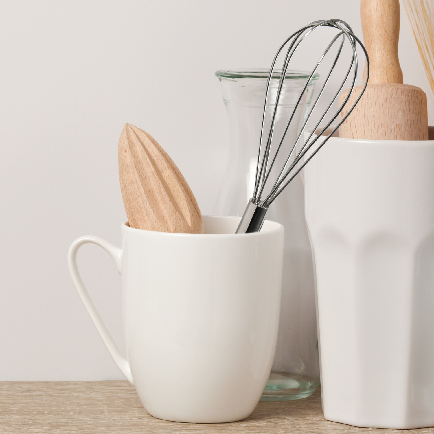This elegant whisk features sleek steel construction finished with a mango wood handle and leather tie.