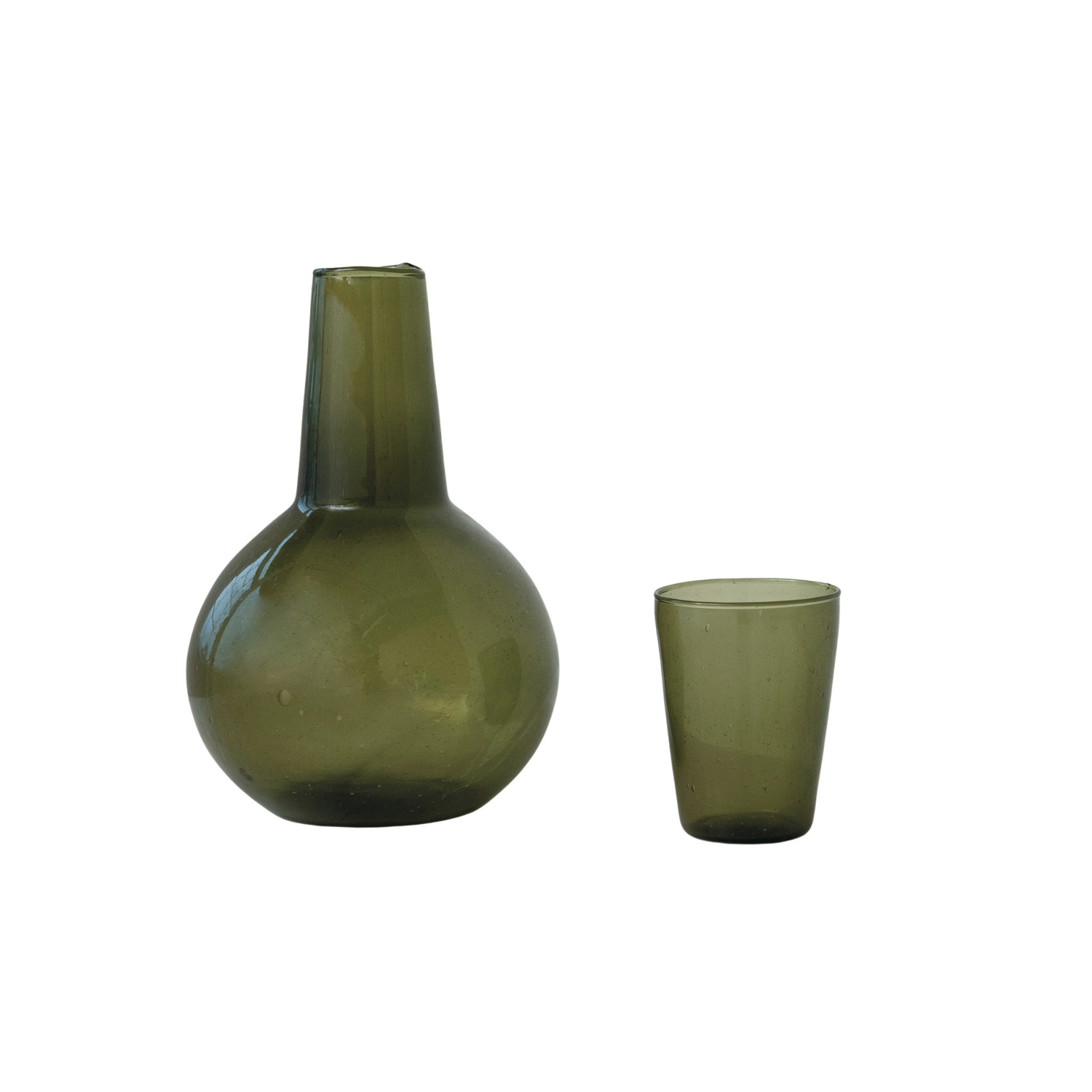 Catalog Name: 6" Round x 9"H 56 oz. Recycled Glass Carafe w/ 6 oz. Drinking Glass, Green, Set of 2