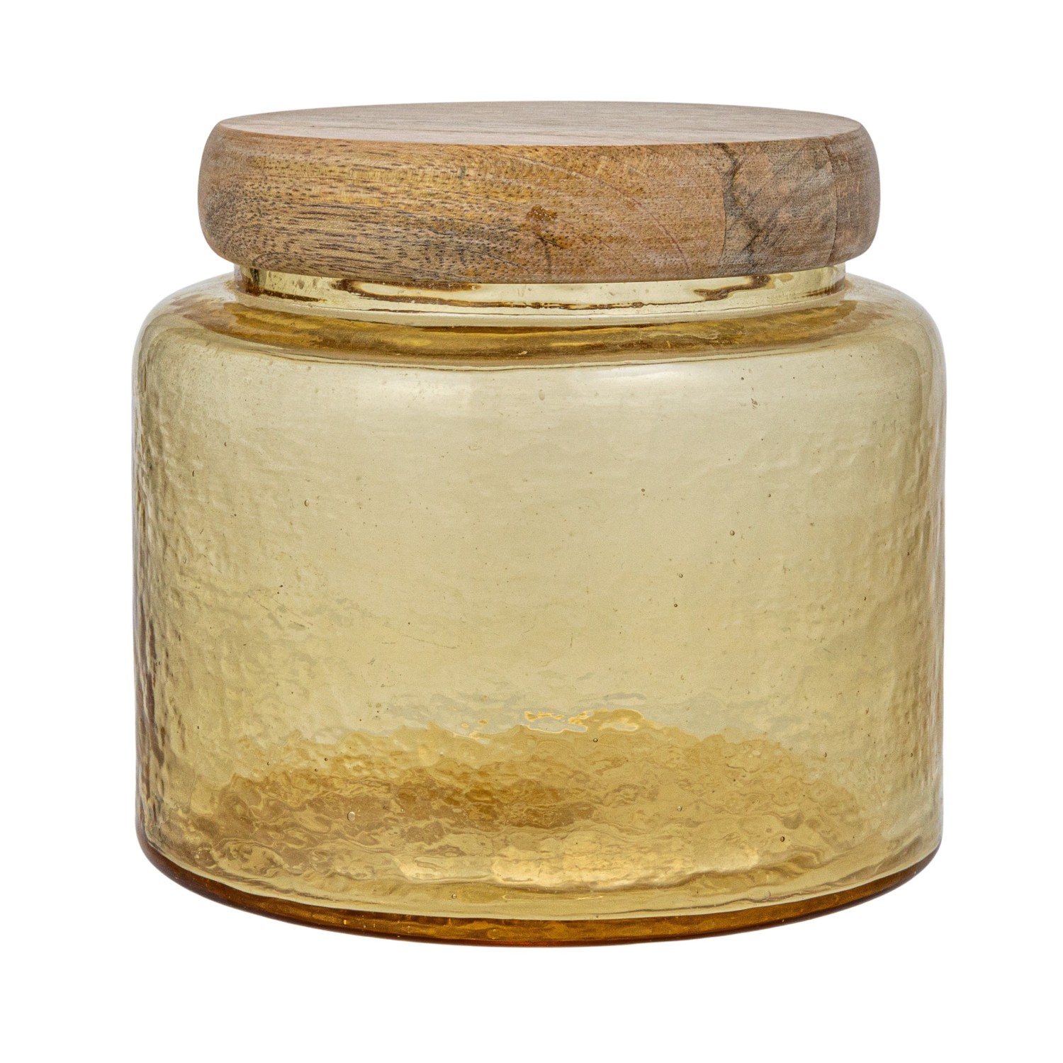 Catalog Name: 6" Round x 5-1/2"H 1-1/2 Quart Hammered Glass Jar w/ Mango Wood Lid, Yellow & Whitewashed