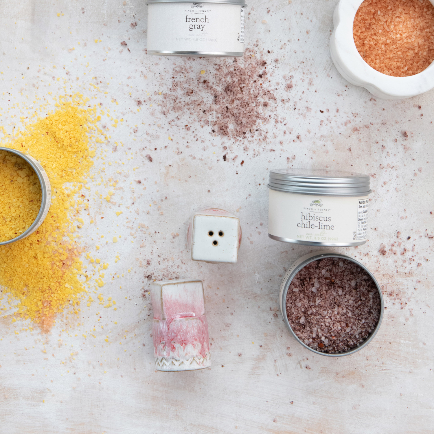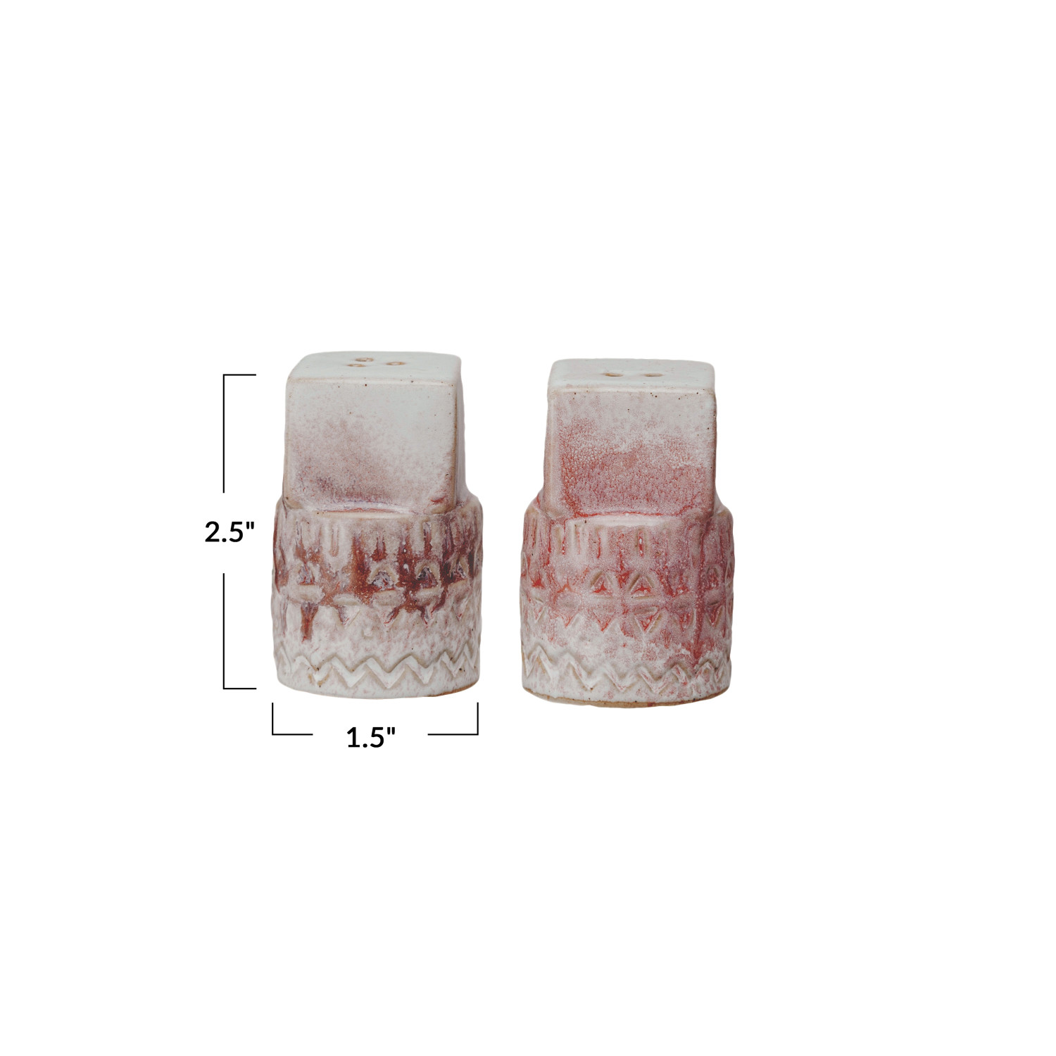 Catalog Name: 1-1/2" Round x 2-1/2"H Stoneware Geometric Shaped Salt & Pepper Shakers, Reactive Glaze, White & Berry Color, Set of 2 (Each One Will Vary)