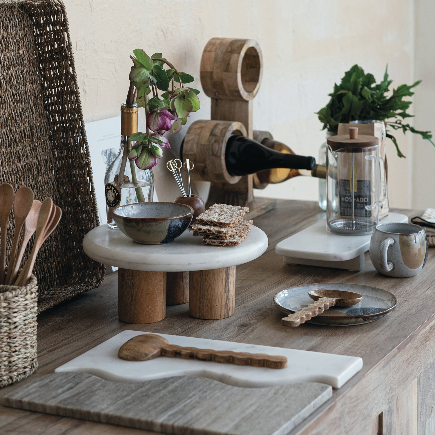 This Elevated Marble and Wood Food Pedestal is a statement of refined taste and quality craftsmanship. The white marble top, 1.25 inches thick, sits atop three mango wood legs, each 4 inches high, combining to create a striking contrast of textures and colors. With a 15-inch diameter and standing 7 inches tall, it provides a generous surface to display culinary delights. Whether it's a centerpiece for a festive occasion or a chic addition to everyday decor, this food pedestal brings a touch of luxury to any setting. Its knock-down design ensures easy storage and transport, making it as practical as it is beautiful.