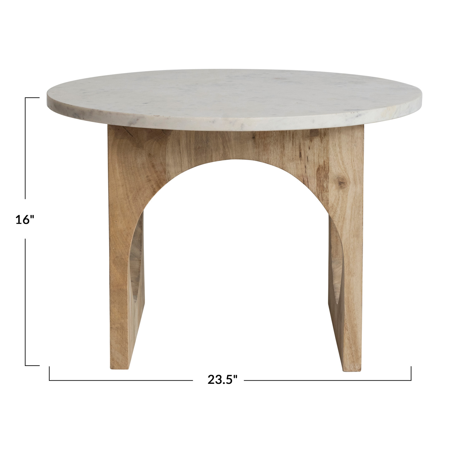 This mango wood table with a marble top adds sophistication and style to any space. It has a round marble top that is smooth and glossy, giving it a luxurious and refined look. The marble top is easy to clean and resistant to stains and scratches, ideal for holding drinks, snacks, books, or décor items. The table has a mango wood base that is sturdy and durable, with a natural color and texture that contrasts with the marble top. The base has four legs that are slightly tapered and curved, adding flair and elegance to the design. The table measures 23.5 inches in diameter and 16 inches in height and has a weight capacity of 66 pounds. It can serve as a coffee table, an accent table, or a side table in any room. It complements modern, glam, or transitional style homes with its stunning and elegant design. This mango wood table with a marble top is a beautiful and functional piece of furniture that enhances any space with its sophistication and style. A stunning and elegant table with a round marble top and a mango wood base. A great choice for modern, glam, or transitional-style homes. Features a smooth and glossy marble top that is easy to clean and resistant to stains and scratches. Made of mango wood and marble for durability and quality.