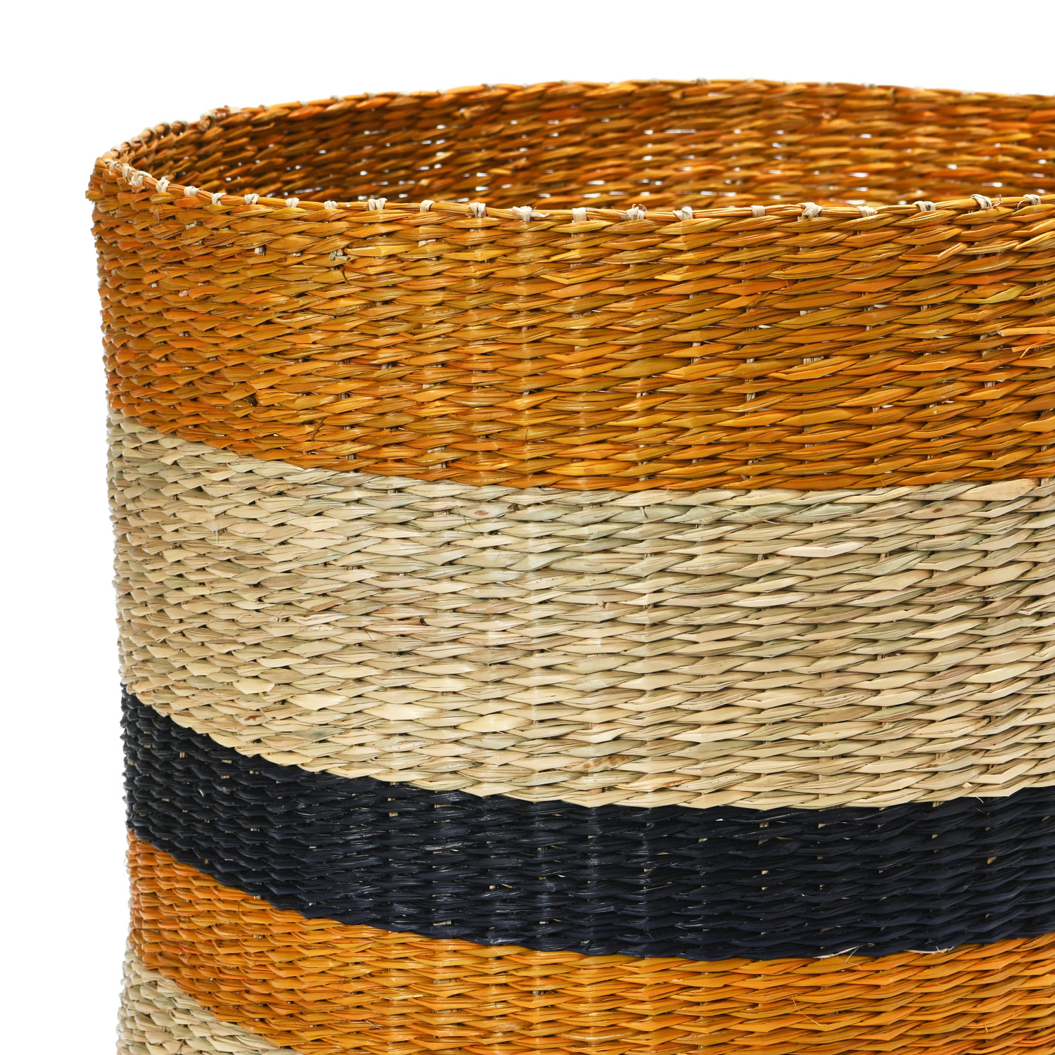 This bold set of decorative baskets showcases intricately hand-woven seagrass construction in multiple rich contrasting hues. Set of 2 multi-tone woven seagrass baskets. Add a dash of boho charm to any living space with these stylishly versatile baskets. Made from 100% seagrass.