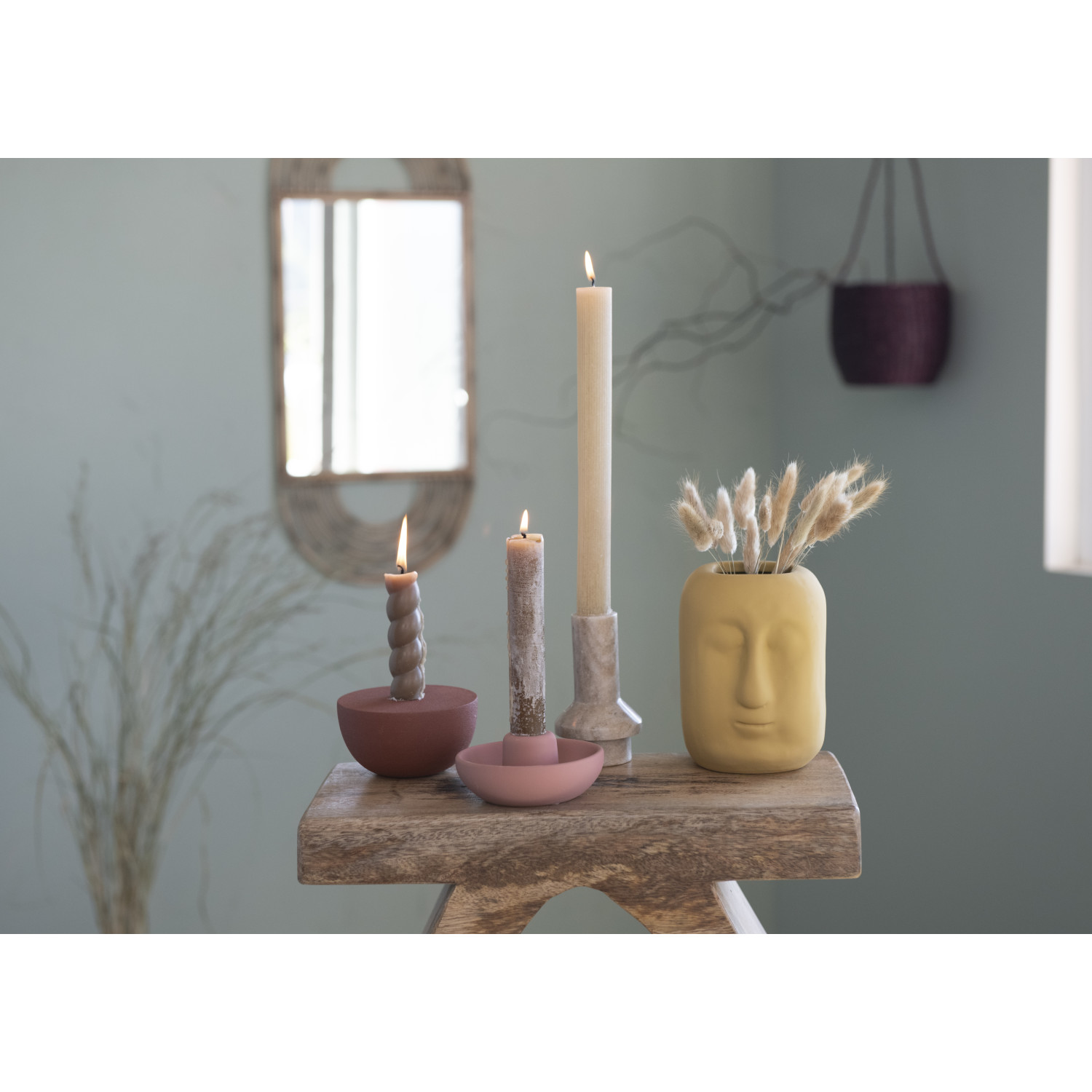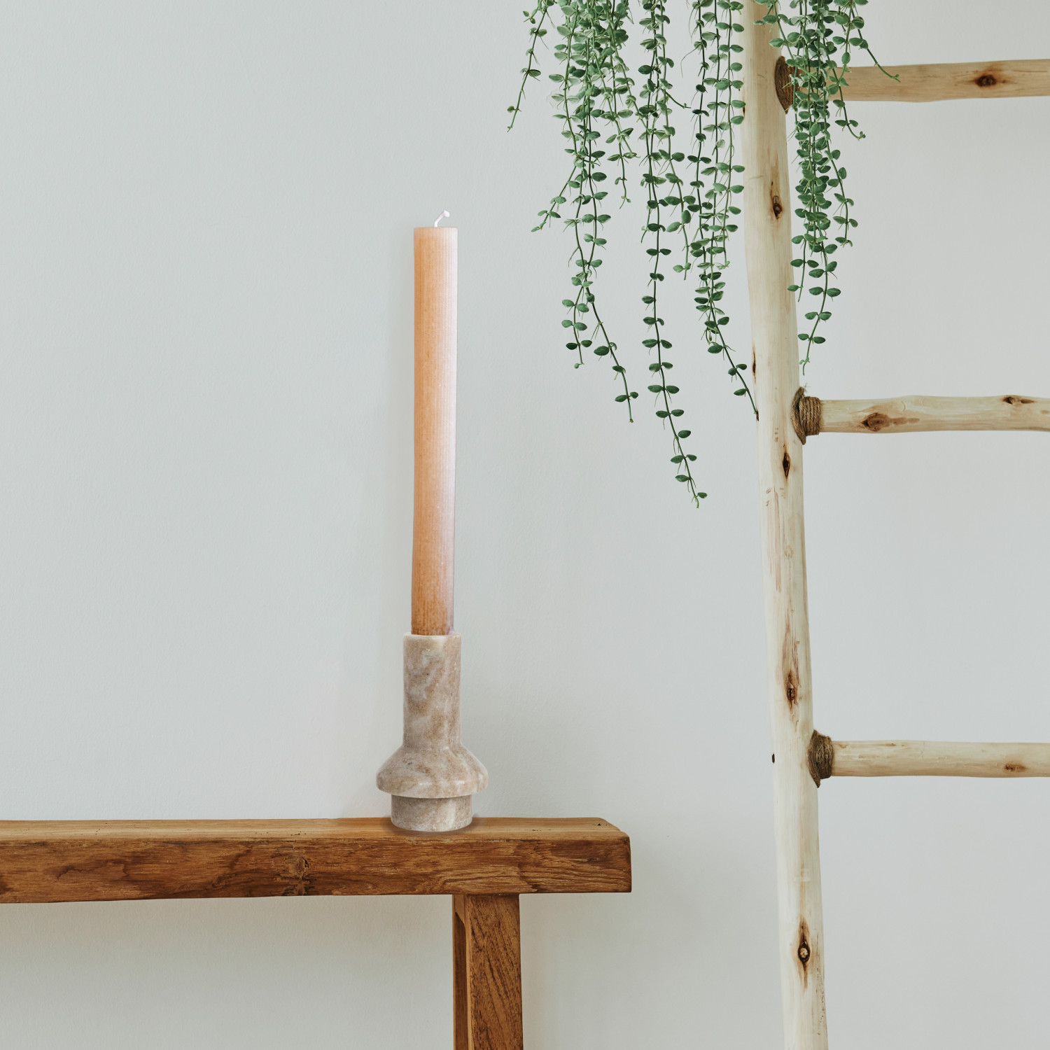 A simple and elegant candle holder with a polished marble surface and a natural beige color. Suitable for any home decor style, especially classic, contemporary, or minimalist. Perfect for creating a cozy and romantic mood on a dining table, a mantelpiece, a console table, or a nightstand. Made of high-quality marble material that is durable and easy to clean.