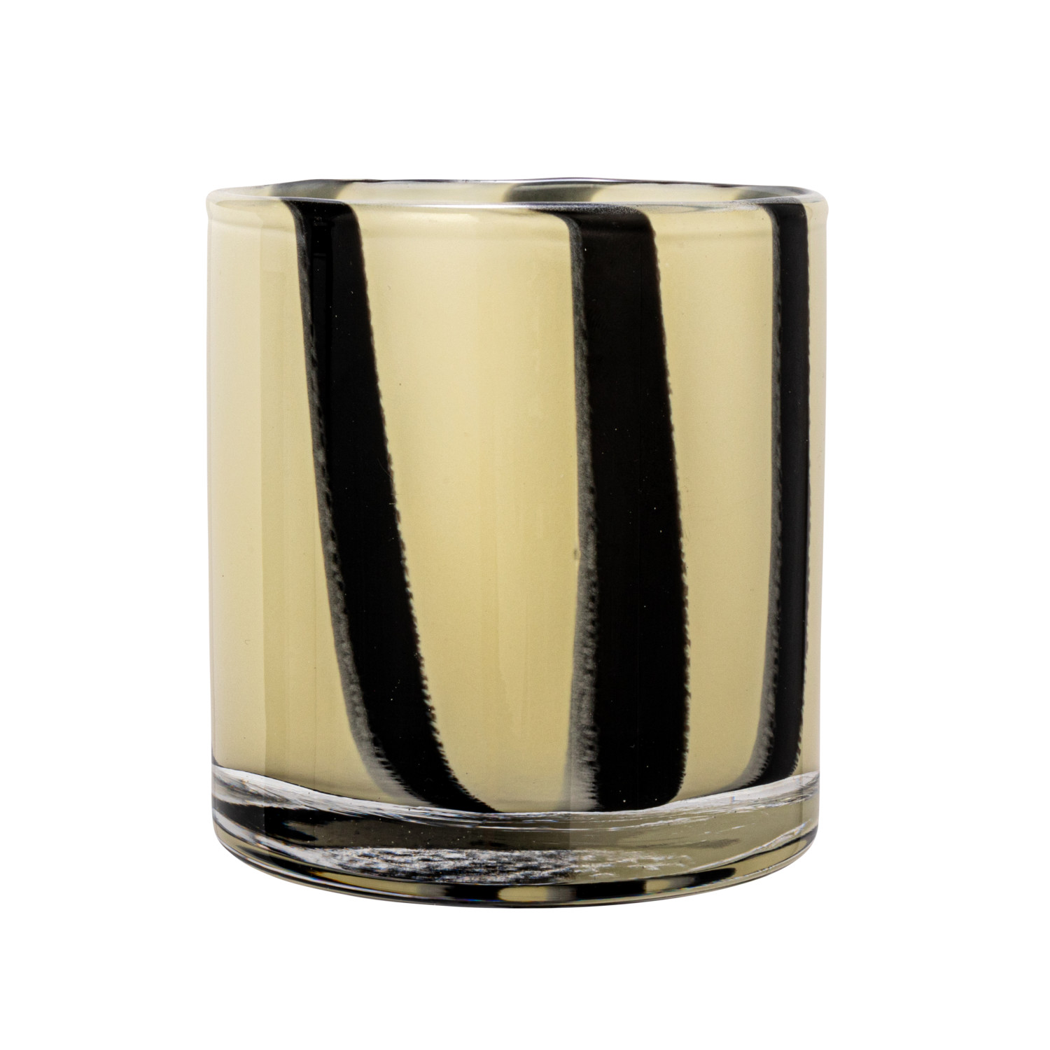 Catalog Name: 4" Round x 4"H Art Glass Striped Candle Holder/Vase, Cream Color & Black