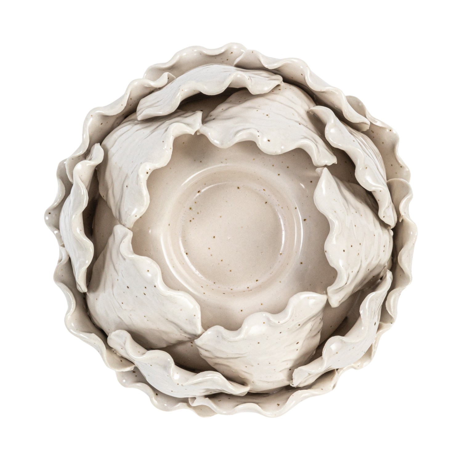 Catalog Name: 5" Round x 3-1/4"H Handmade Stoneware Artichoke Shaped Tealight Holder, Reactive Glaze, Cream Color (Each One Will Vary)