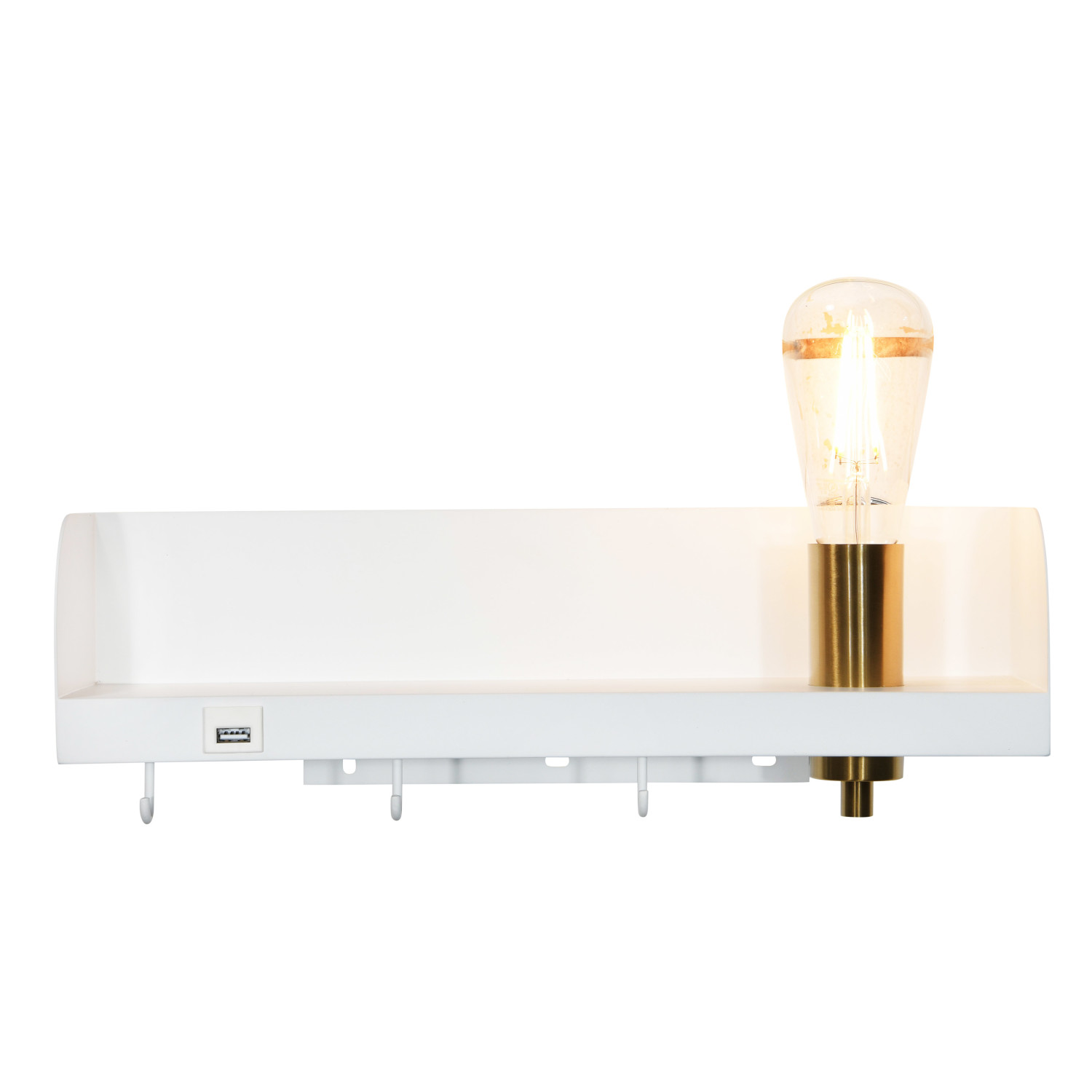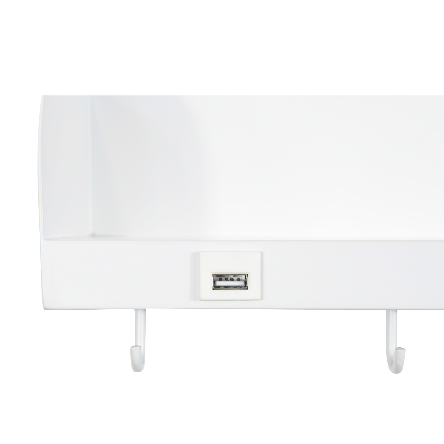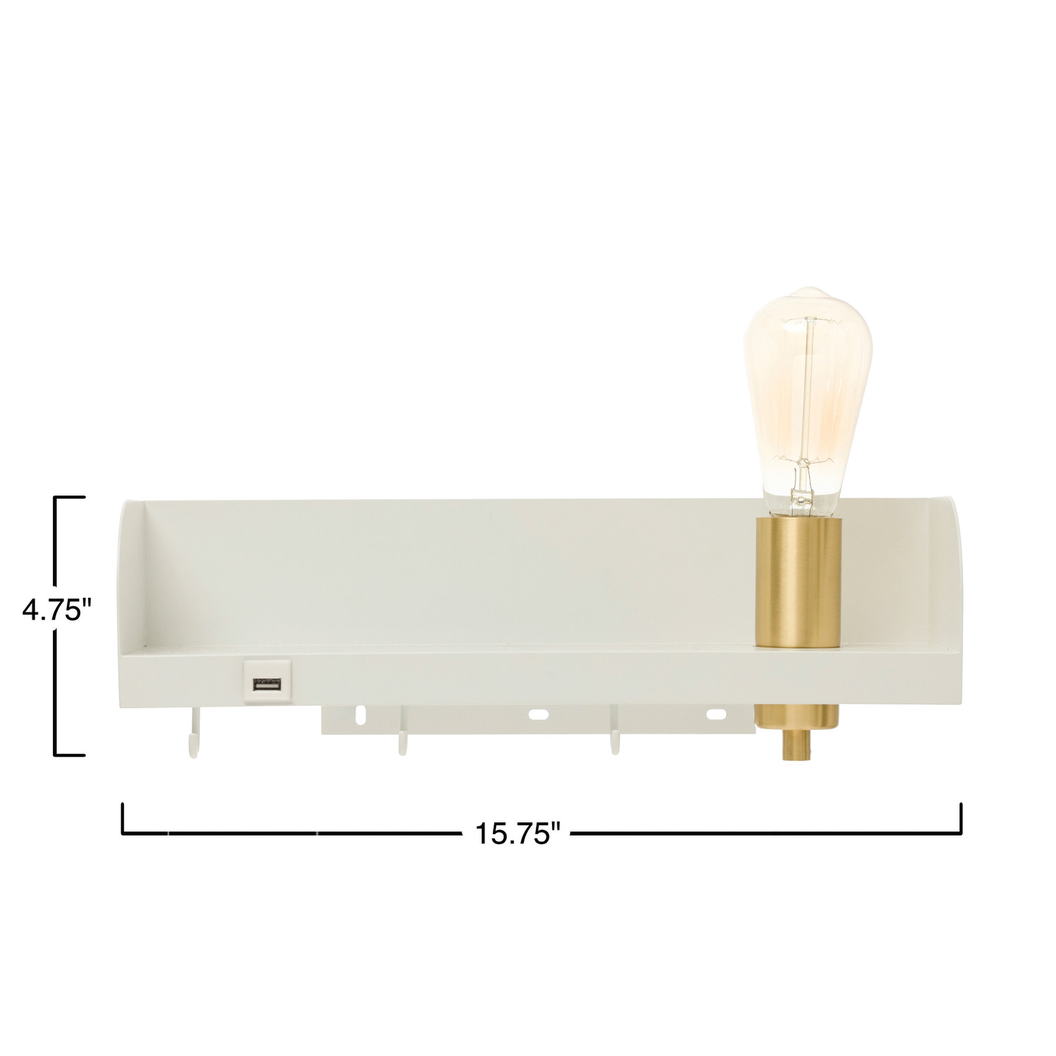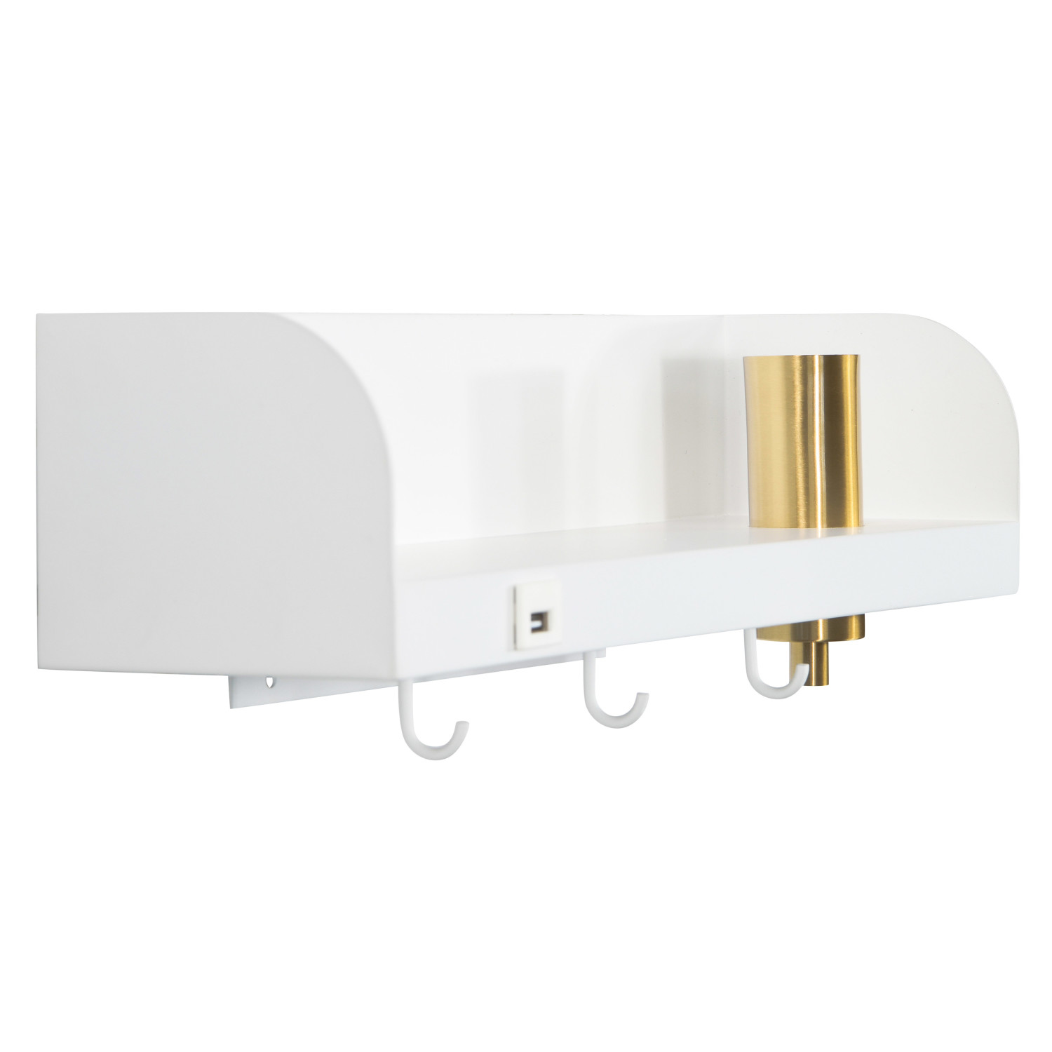 Catalog Name: 15-3/4"W x 4-1/2"D x 4-3/4"H Metal Wall Shelf w/ Light, USB, 3 Hooks & Inline Switch, Gold Finish, White