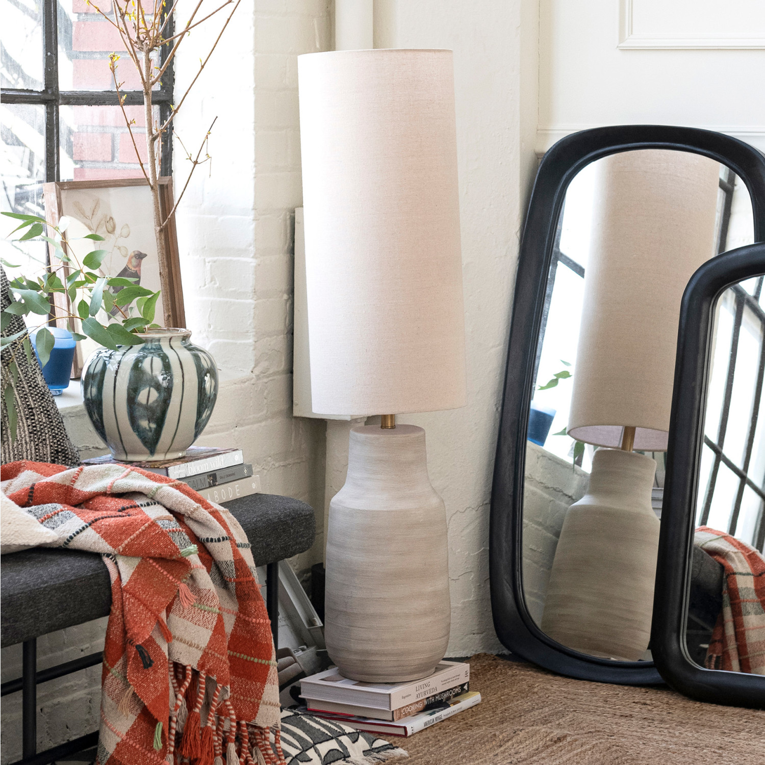 Catalog Name: 11" Round x 45"H Ceramic Floor Lamp w/ Linen Shade & Inline Switch, Matte Sand Color