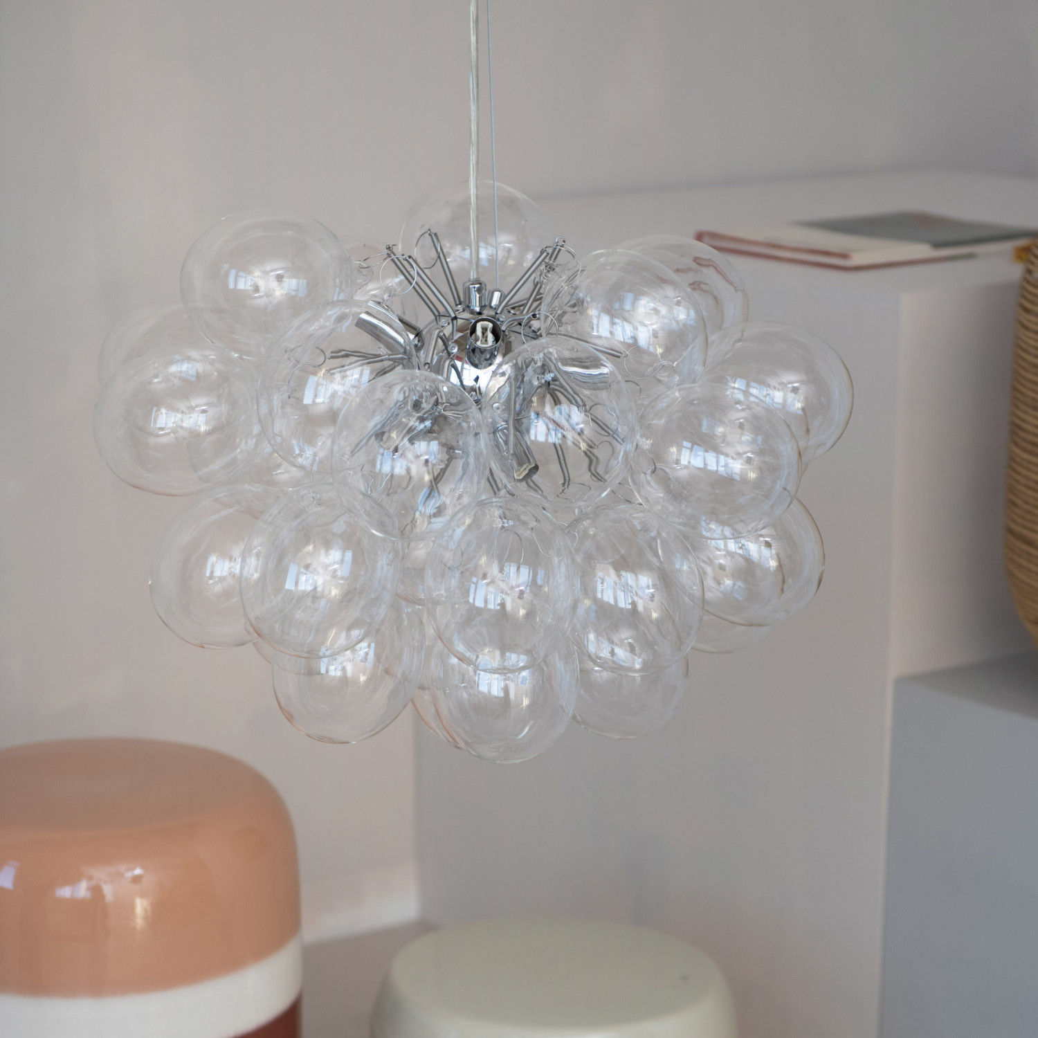 This Glass and Metal Pendant Lamp is a stunning lighting fixture that combines both form and function. The lamp provides ample illumination and creates a warm, inviting atmosphere in any space. The 6-foot cord allows for versatile installation options, making it suitable for various ceiling heights and room configurations. Designed to be hardwired, this pendant lamp requires 8 G9 LED bulbs, each with a maximum wattage of 25 watts, ensuring energy efficiency and bright lighting. The lamp's dimensions, measuring 19.5 inches in diameter and 19.5 inches in height, perfect for dining rooms, living areas, or entryways. Its modern and elegant style seamlessly integrates into contemporary interiors, adding a touch of sophistication and charm to any room.