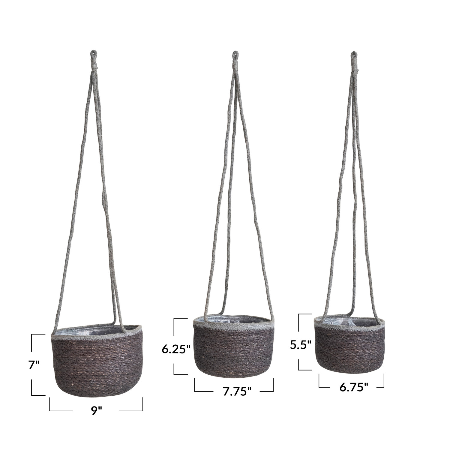 Catalog Name: 9" Round x 7"H, 7-3/4" Round x 6-1/4"H & 6-3/4" Round x 5-1/2"H Hanging Hand-Woven Seagrass Planters w/ Jute Rope Hangers & Plastic Liners, Charcoal Color & Grey, Set of 3 (Holds 8", 6" & 5" Pots)