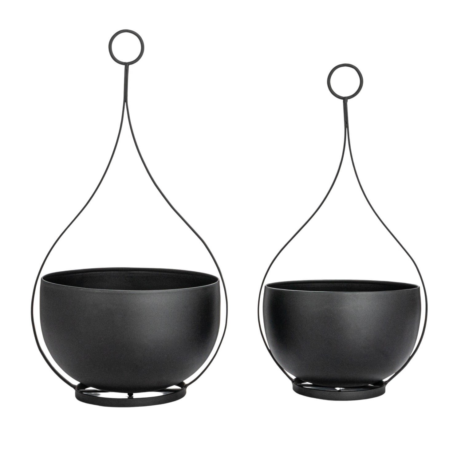 Catalog Name: 9-1/2" Round x 19-1/2"H & 8-1/2" Round x 17-1/2"H Hanging Metal Planters, Matte Black, Set of 2 (Holds 9" & 8" Pots)