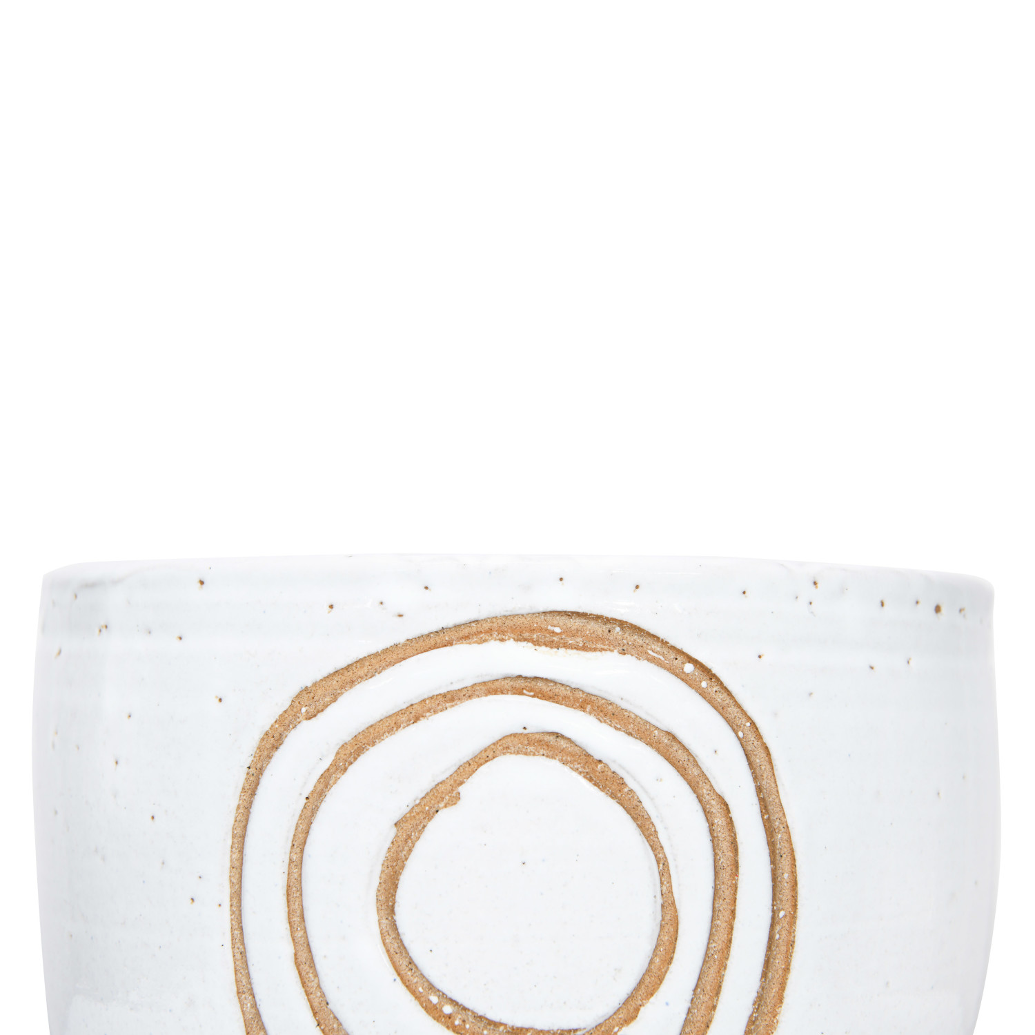 The planter is crafted from 100% terracotta. This planter is a round bowl shape with an open top to hold a 6" pot. The planter bowl is a creamy sand color with concentric circle detail made of burnt orange lines. The circular pattern is not perfect, but looks hand-drawn, making it very organic and calming.