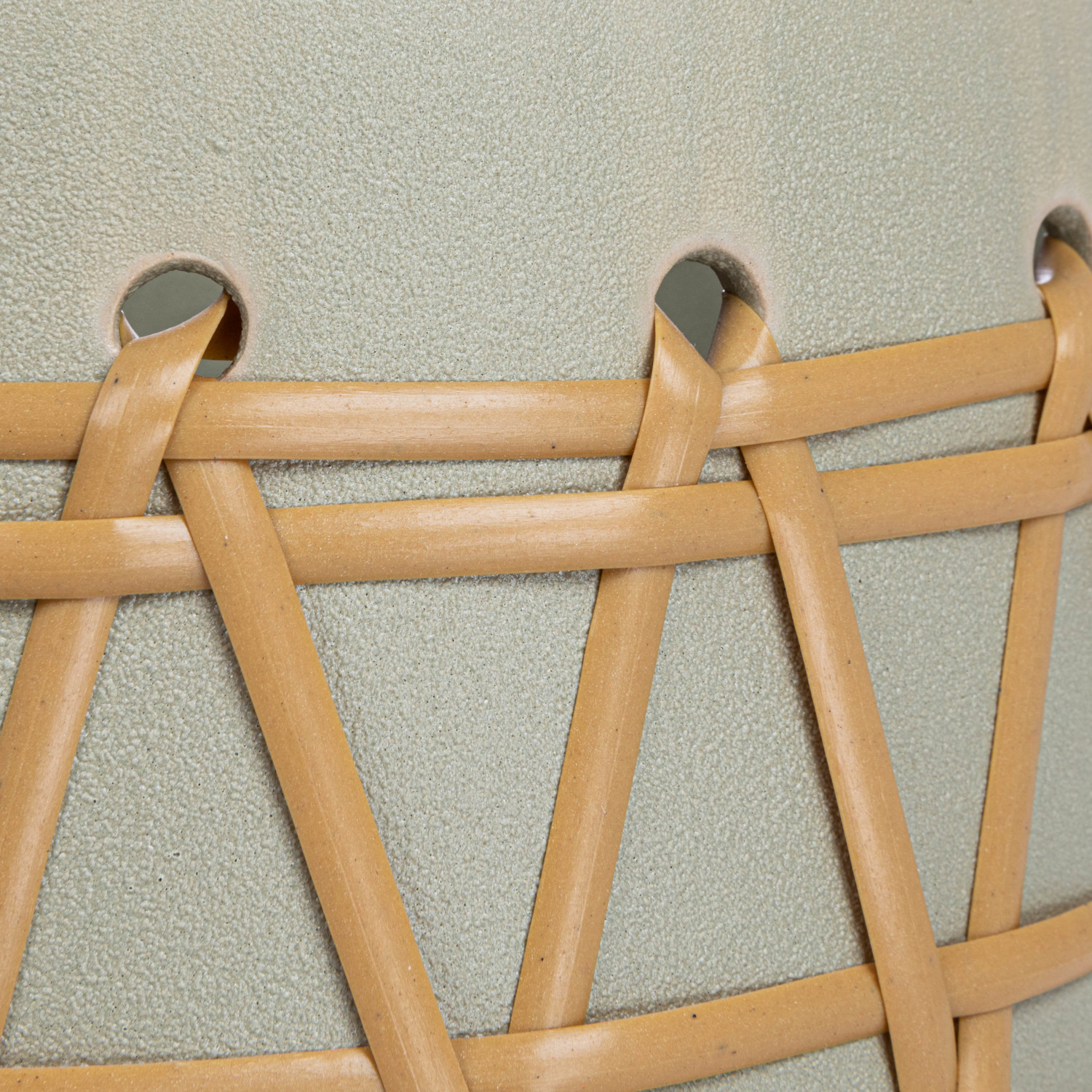 Catalog Name: 9" Round x 8-1/4"H Stoneware Planter w/ Weaving, Matte Celery Color (Holds 8" Pot)