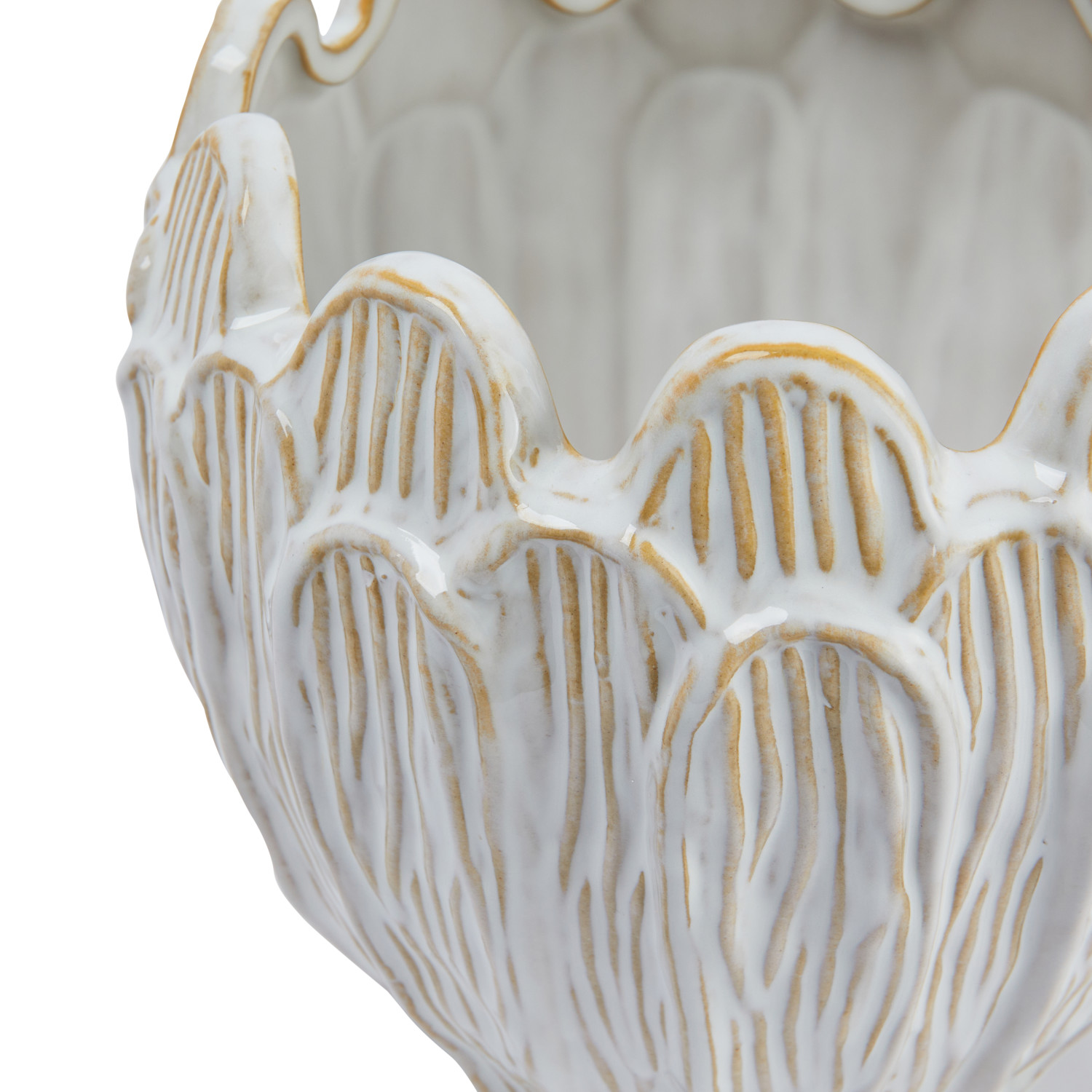 This Debossed Stoneware Flower Shaped Planter with Reactive Glaze in Cream Color creates a cozy and inviting space. This planter is made of high-quality, durable stoneware material with a flower-shaped silhouette and debossed pattern that gives it a rustic and elegant look. The planter has a reactive glaze finish that creates a natural variation of cream color, making each piece unique and beautiful. The planter has no drainage holes, so it is suitable for plants that do not require much water, such as succulents, cacti, or air plants. The planter measures 8.25 inches in diameter and 7.25 inches in height and can hold a large pot. This planter adds French country charm to the space with its lovely design, whether placed on the floor, table, windowsill, or shelf. A lovely stoneware planter that features a flower-shaped silhouette and a debossed pattern. Ideal for adding some French country charm to the indoor or outdoor plants. Durable and easy-to-clean planter with no drainage holes, can be wiped clean with a dry cloth. Made of stoneware.