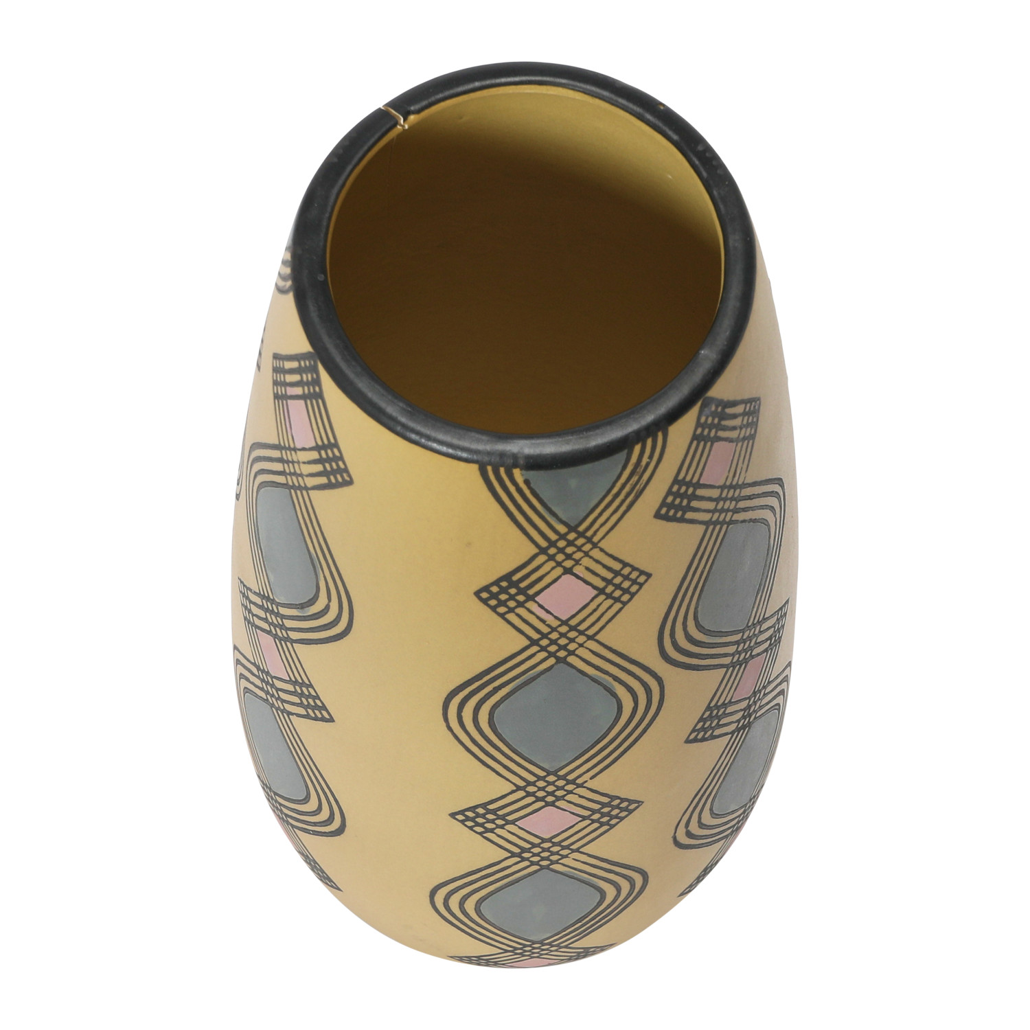 This bold stoneware vase showcases an intricately hand painted 2-tone geometric pattern.