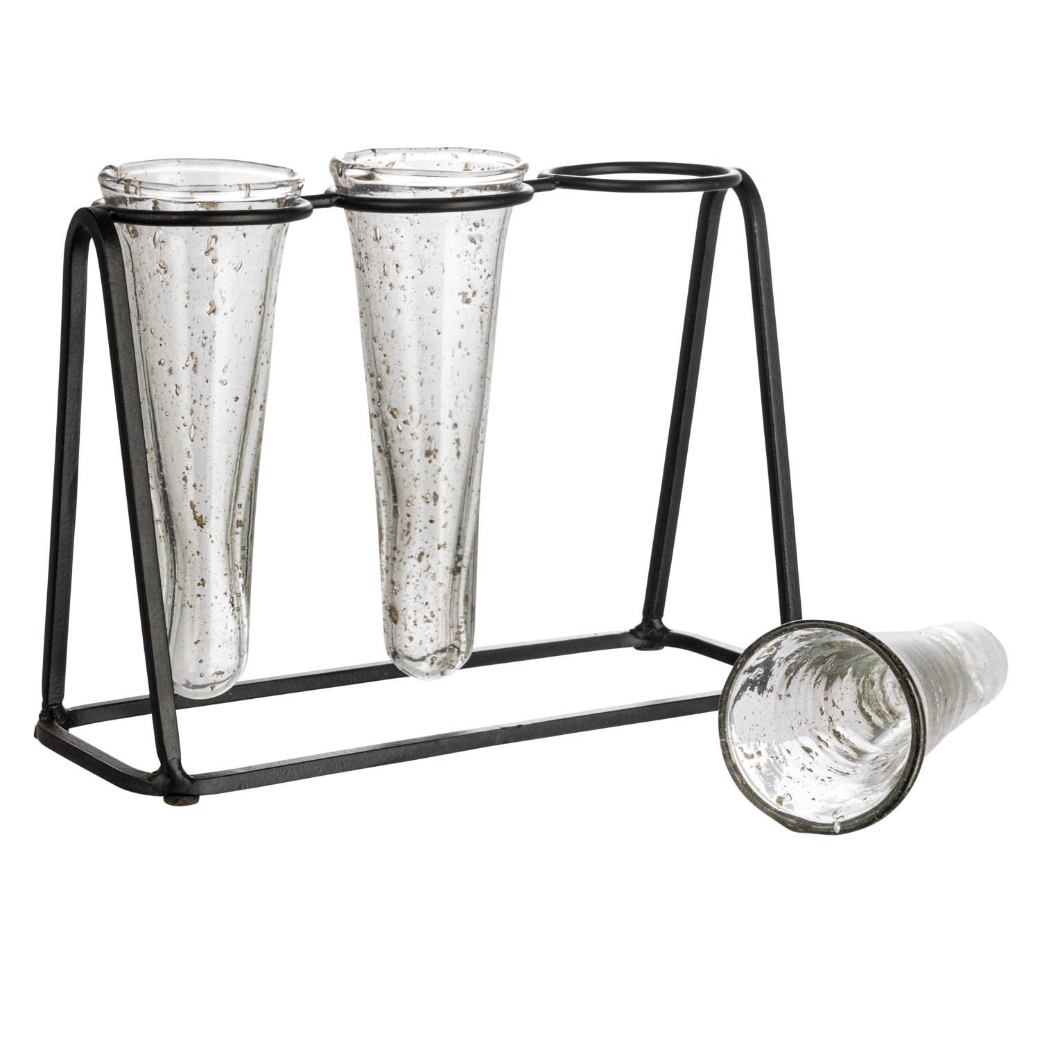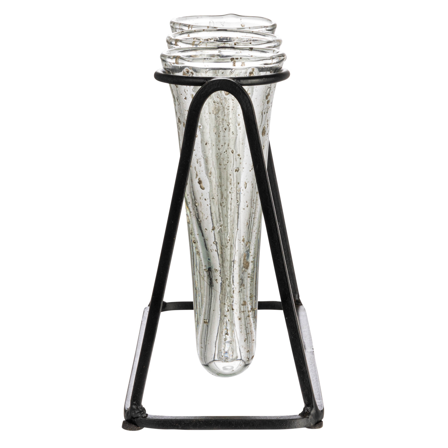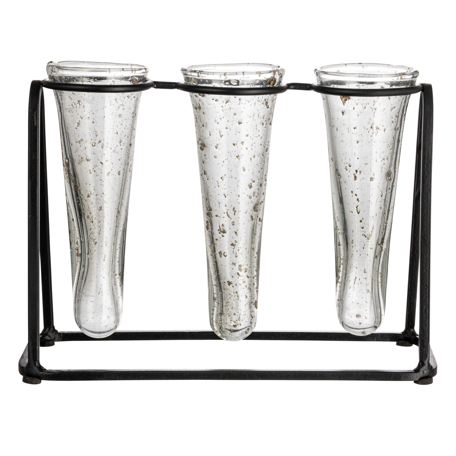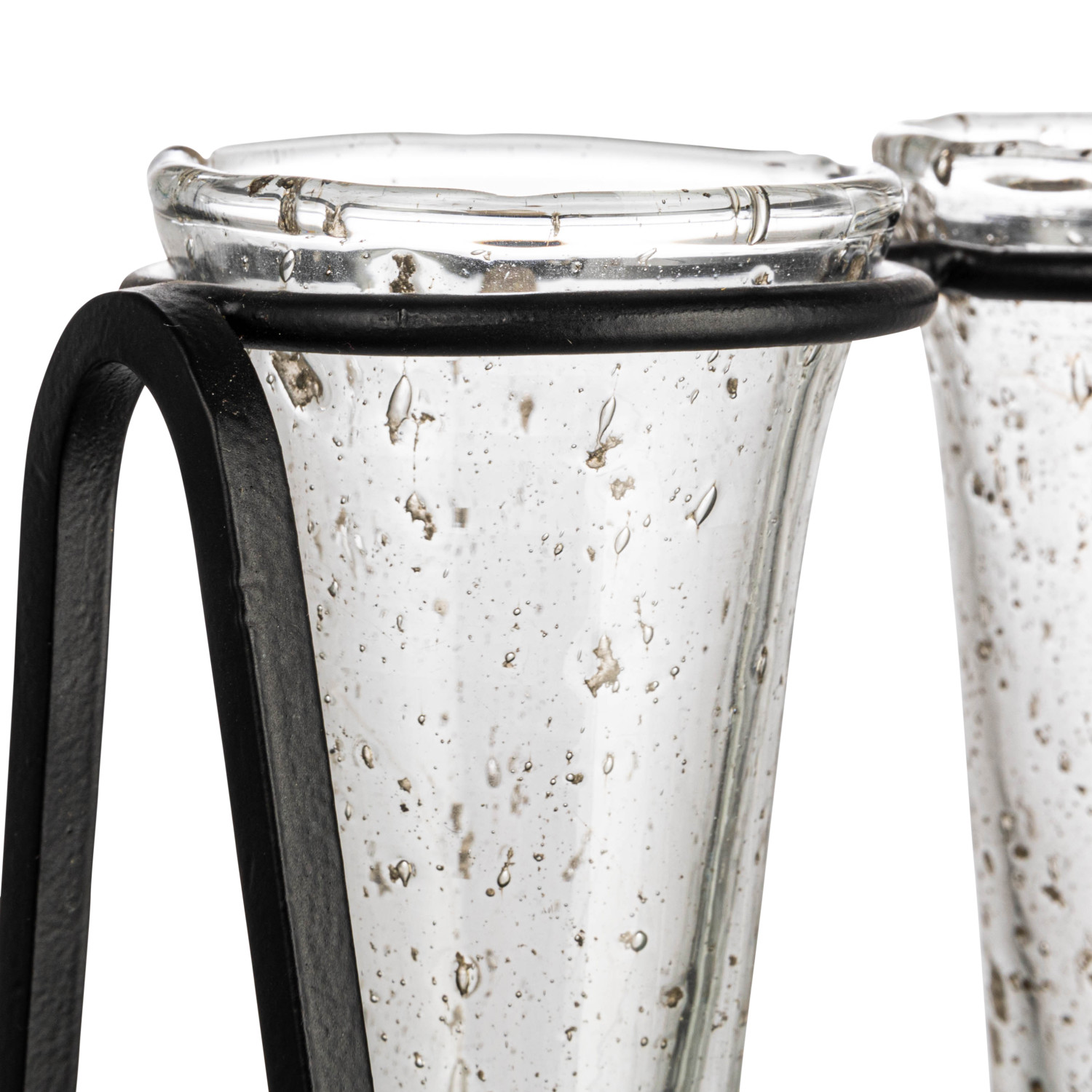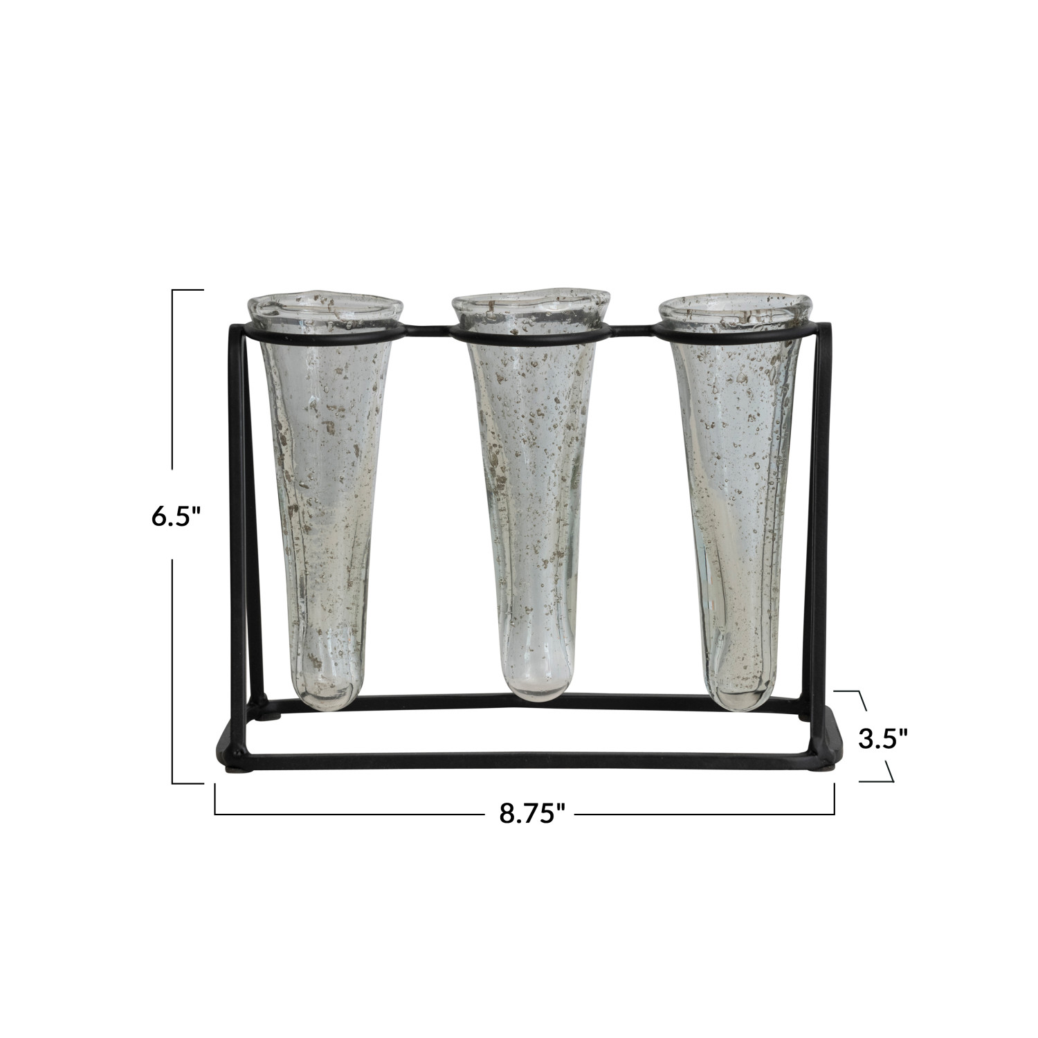 Catalog Name: 8-3/4"L x 3-1/2"W x 6-1/2"H Metal Stand w/ 3 Seeded Glass Vases, Black