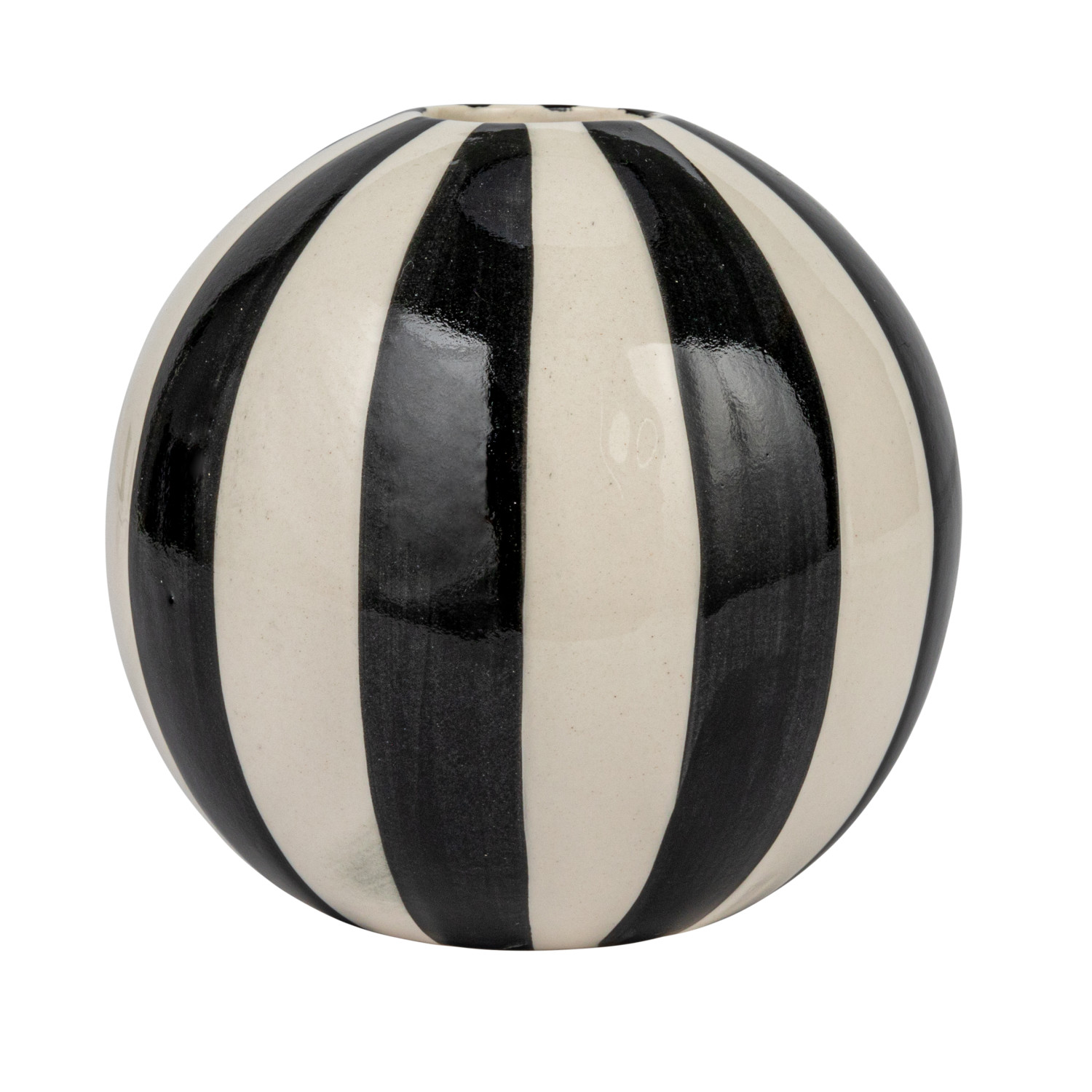 This charming round stoneware vase is adorned with captivating black and white stripes, making it a perfect fit for modern, minimalist, or eclectic interiors. The vase's contemporary design and monochromatic color scheme effortlessly add a stylish and artistic touch to any space. The vase has a sturdy 1-inch round opening that ensures stability and durability, enjoying its beauty for years to come. Whether displayed as a standalone accent or grouped with other decorative items, this vase is sure to turn heads. The vase measures 4.13 inches in diameter and 3.88 inches tall. It is made of stoneware and is easy to clean. It is a unique and versatile piece of décor that is sure to add a touch of beauty to any space. This vase has a round ball shape adorned with captivating black and white stripes. With its contemporary design and monochromatic color scheme that makes it a perfect fit for modern, minimalist, or eclectic interiors. Whether displayed as a standalone accent or grouped with other decorative items, it has a 1-inch round opening that can be displayed as a standalone accent or grouped with other decorative items. Made of stoneware.