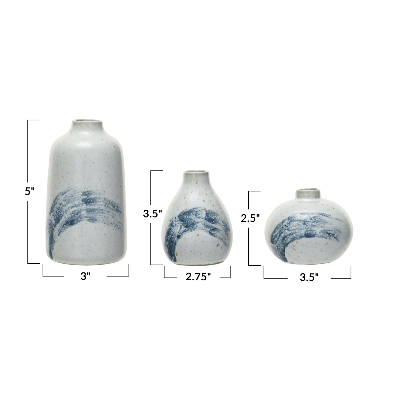 Catalog Name: 2-3/4" Round x 3-1/2"H, 3-1/4" Round x 2-1/2"H & 3" Round x 5"H Hand-Painted Stoneware Vases, Reactive Glaze, Cream Color Speckled & Blue, Set of 3 (Each One Will Vary)