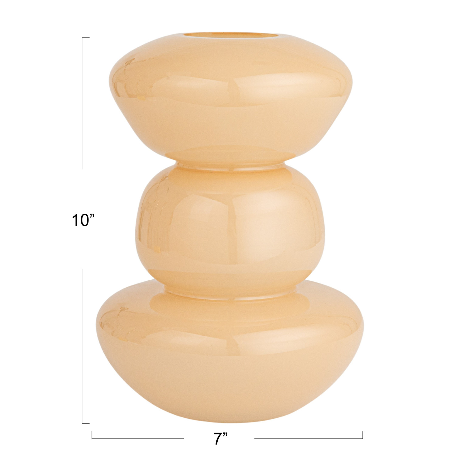 This Tall Natural Elegance Glass Vase is a sculptural beauty, standing 9.75 inches high with a 7-inch diameter. Its distinctive three-layered top stacks gracefully, creating a flowing silhouette that captures the eye. The 2.5-inch opening is precisely sized to cradle a bouquet, allowing each stem to fan out beautifully. The vase's opaque nude color brings a warm, natural tone to any room, while its glass construction provides a smooth, tactile experience. Whether displayed alone or as part of a collection, this vase is a celebration of organic form and subtle sophistication.