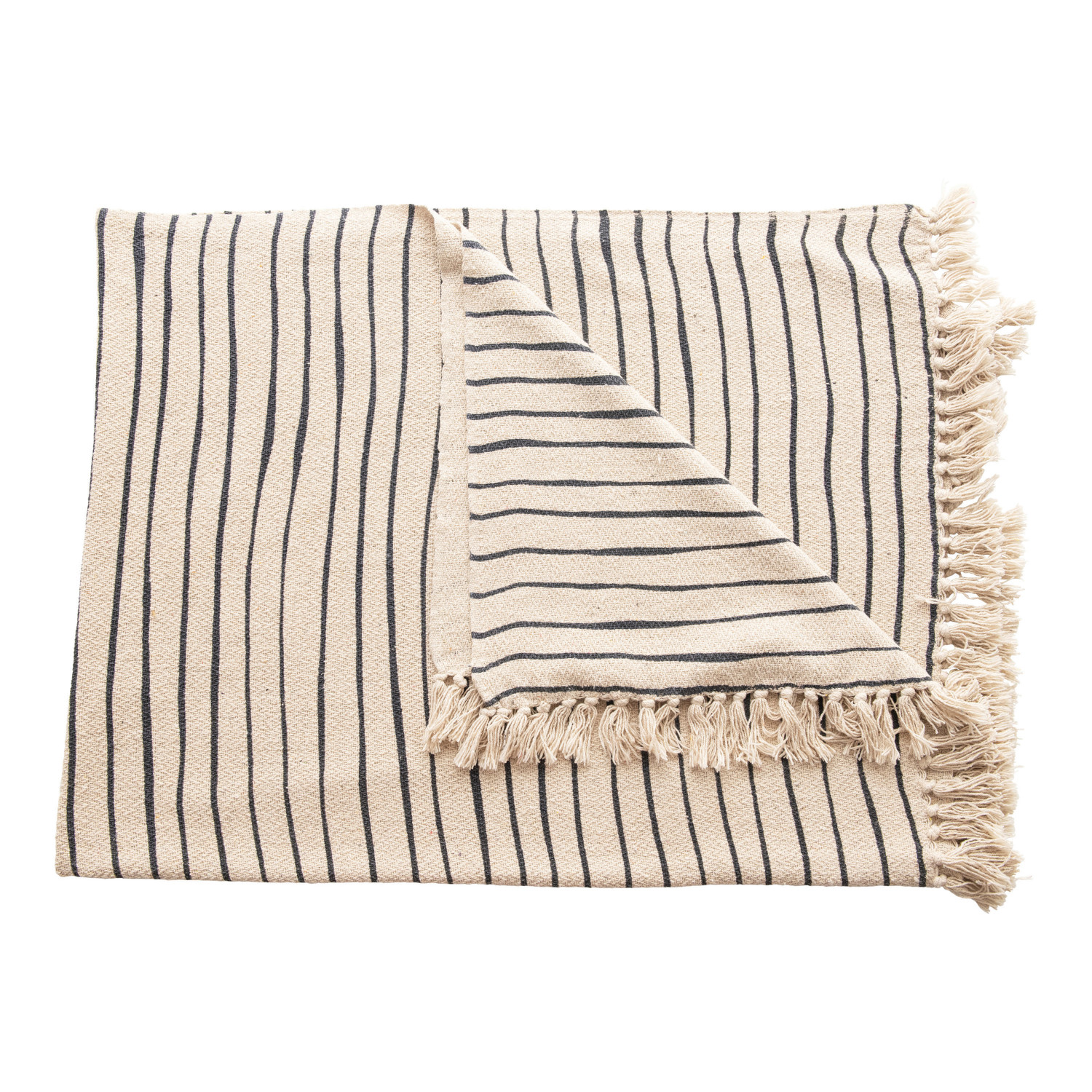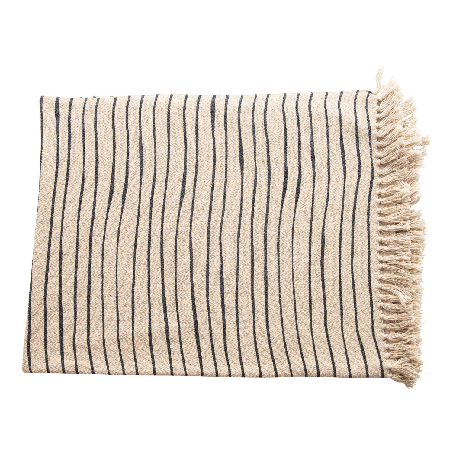 Catalog Name: 60"L x 50"W Woven Recycled Cotton Blend Throw w/ Stripes & Fringe, Black & Cream Color