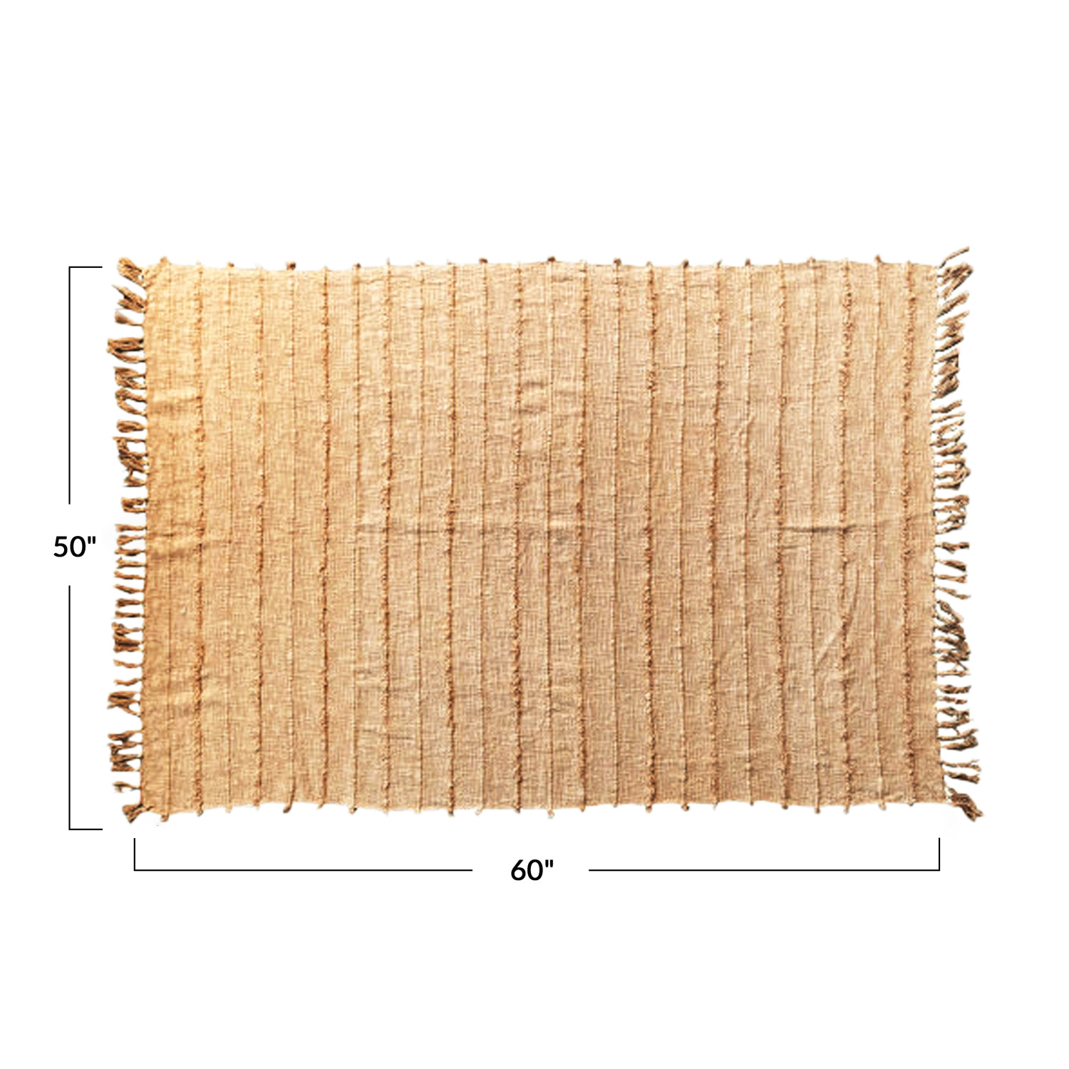 Catalog Name: 60"L x 50"W Stonewashed Woven Cotton Slub Throw w/ Tufted Stripes & Fringe, Beige
