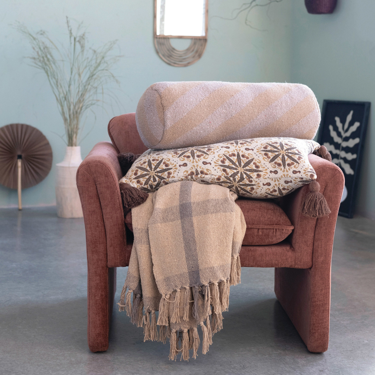 24" x 16" Recycled Cotton Blend Lumbar Pillow w/ Tassels, Polyester Fill