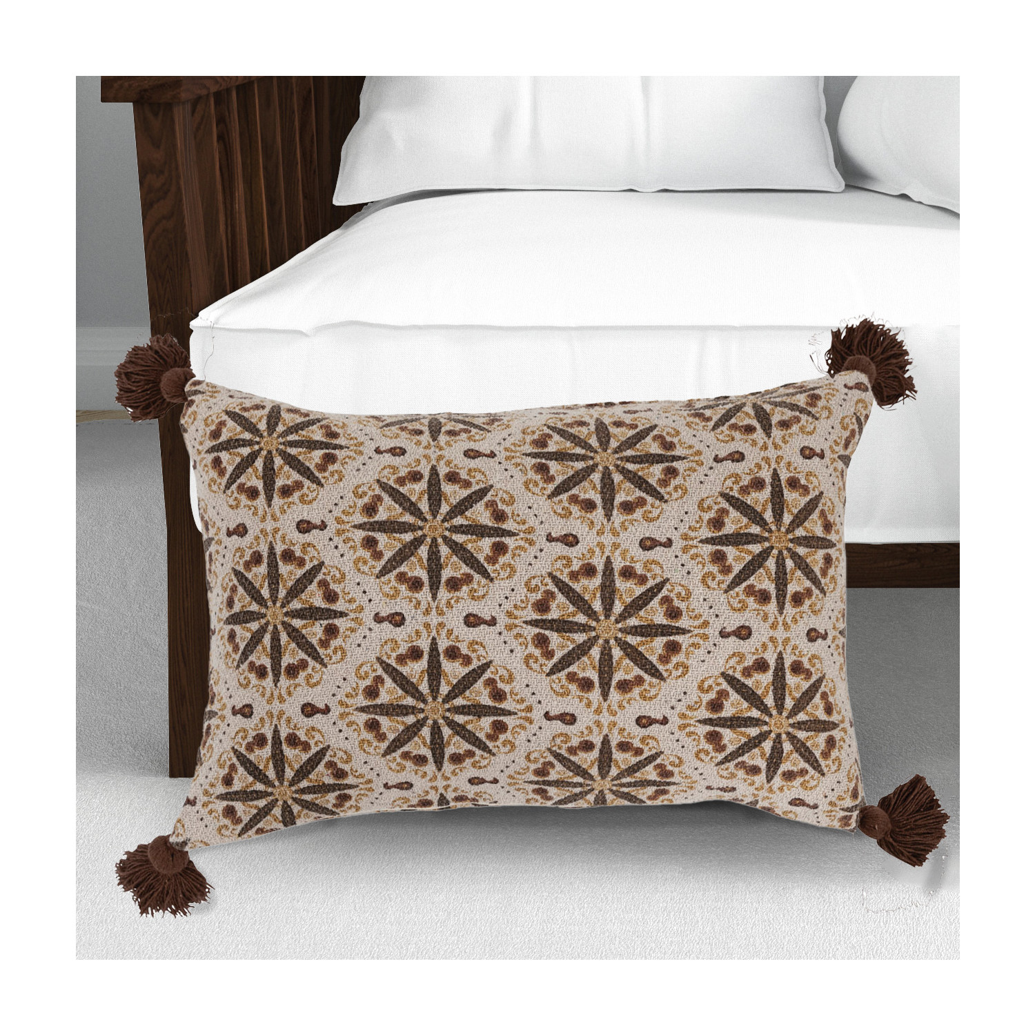 This global-inspired lumbar pillow cover showcases a striking floral medallion print on recycled cotton, finished with decorative tassels. Multicolor recycled cotton blend lumbar pillow with floral medallion print and tassels. Express your constantly evolving style with the simple addition of this eye-catching pillow. Removable cotton pillow cover with polyester insert; Hidden in seam zipper closure; Machine wash cold with mesh bag, gentle cycle; Do not bleach, tumble dry low, warm iron if needed.
