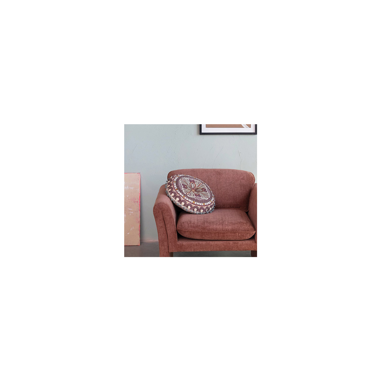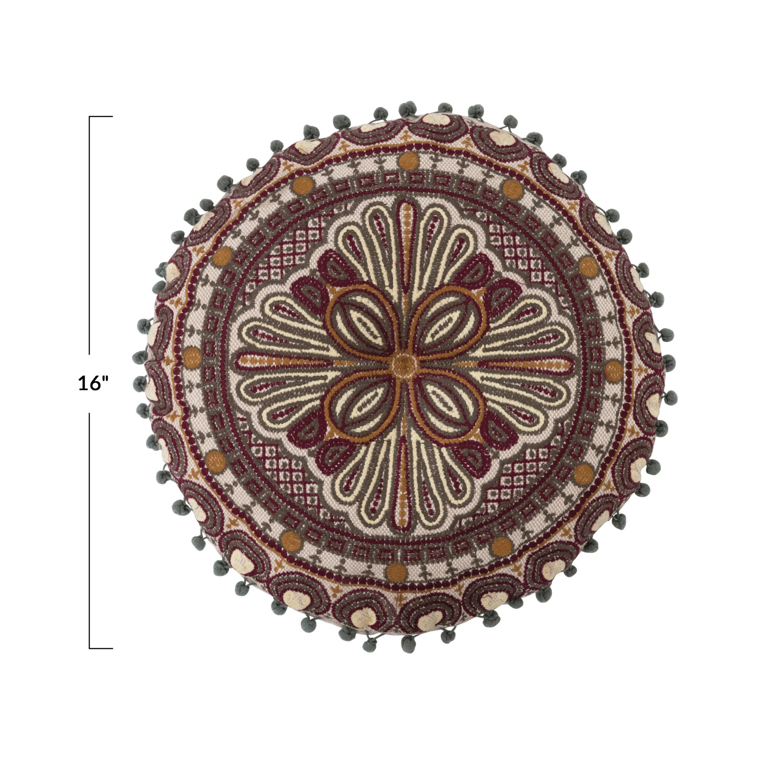 Catalog Name: 16" Round Cotton Embroidered Pillow w/ Pom Pom Trim, Multi Color