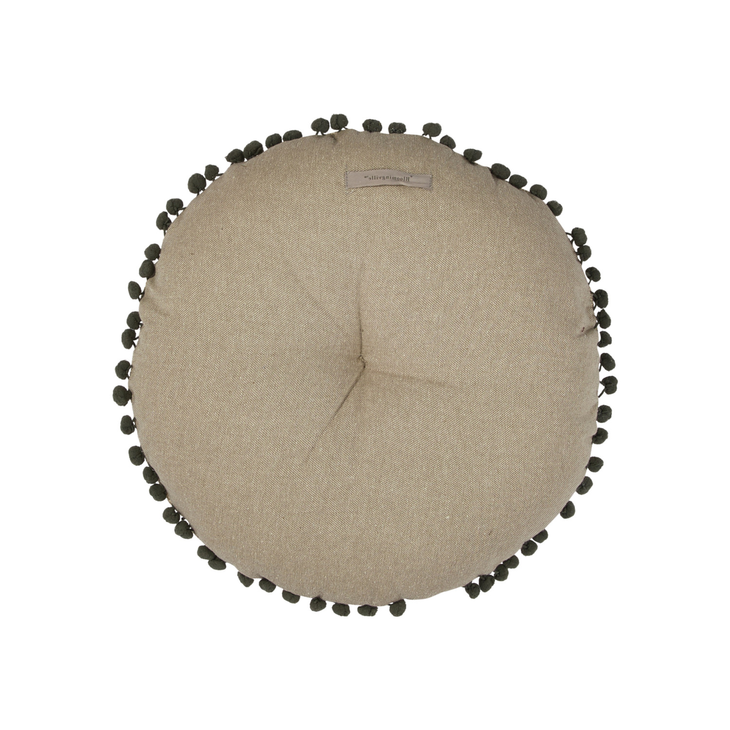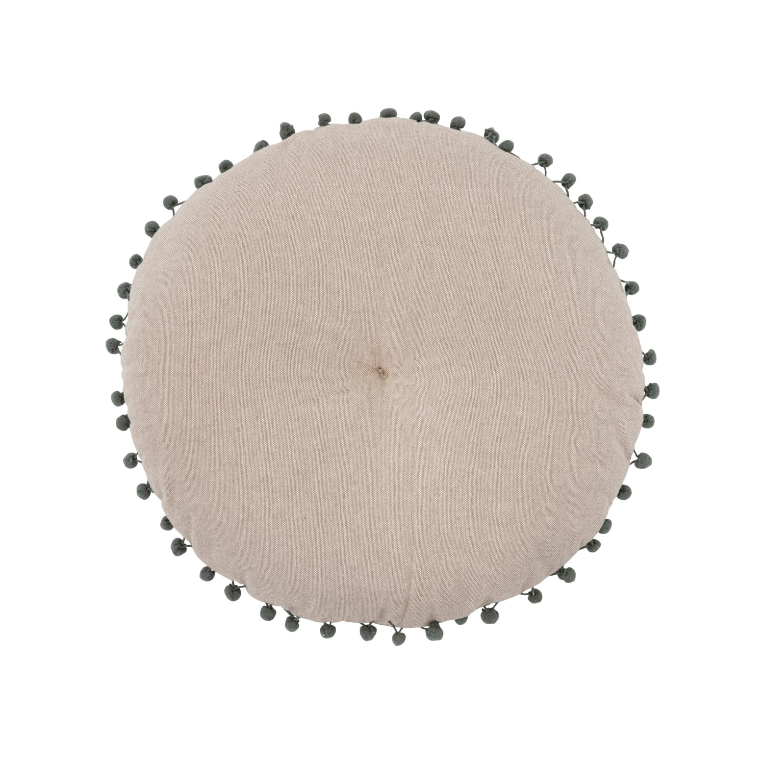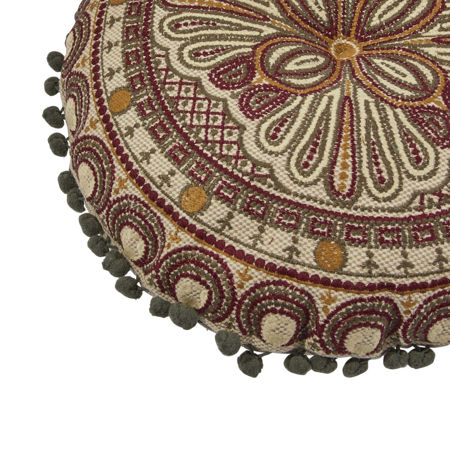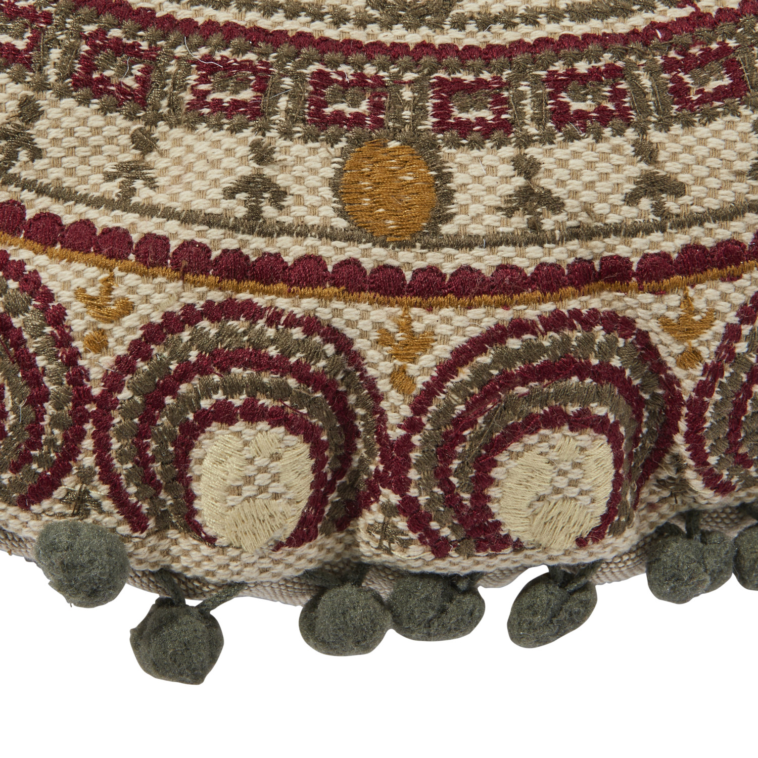 This bold throw pillow features an intricately embroidered Scandinavian print on cotton, finished with playful pom poms. Multicolor round cotton throw pillow with embroidered print and pom pom trim; Natural cotton encasement on back. Express your constantly evolving style with the simple addition of this eye-catching pillow. Round throw pillow; Spot clean only.