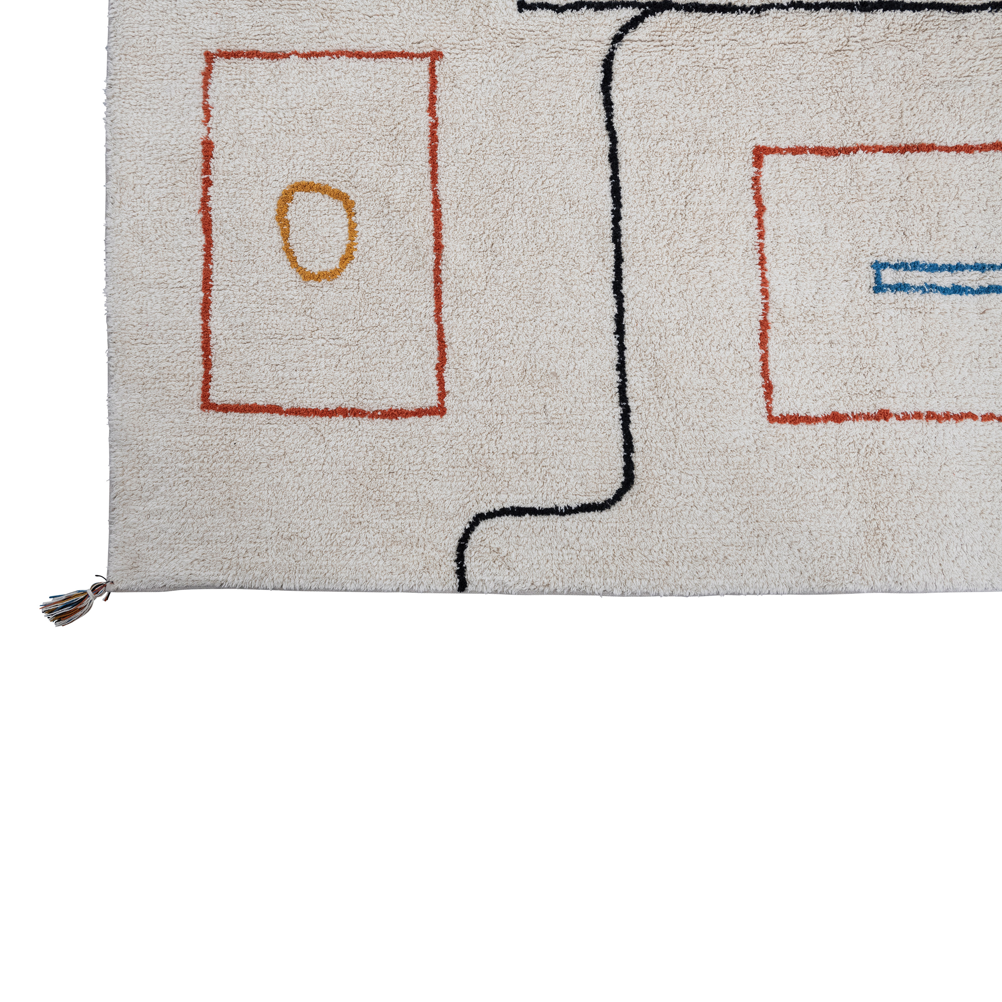 This contemporary, southwestern influenced area rug showcases supple, tufted cotton with an abstract design, finished with decorative tassels. Multicolor tufted cotton rug with abstract pattern and tassels. Spot clean only. Made from 100% cotton blend.