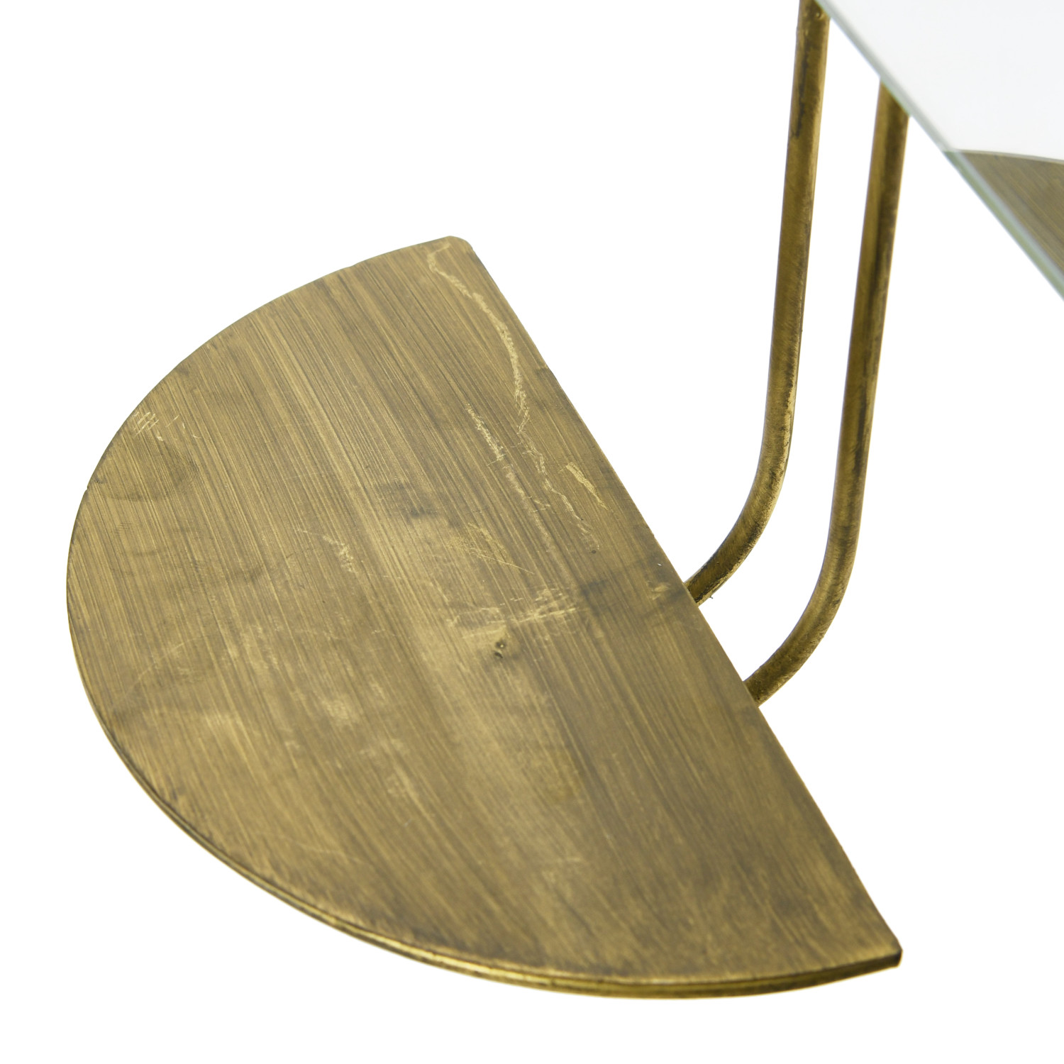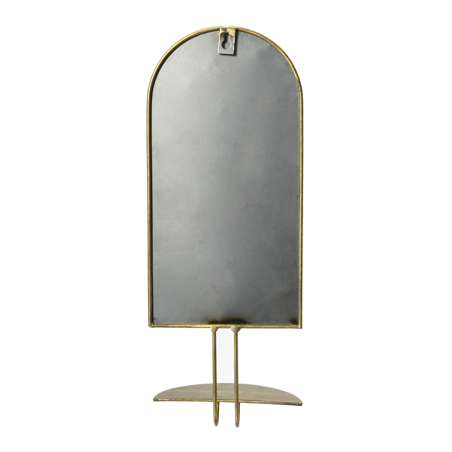 This strikingly modern wall mirror features an arched silhouette encased in a sleek metal frame with an attached shelf. Arched wall mirror with antique gold metal frame and attached shelf. Add style and depth to any living space with this artfully crafted mirror. Made from glass and iron.