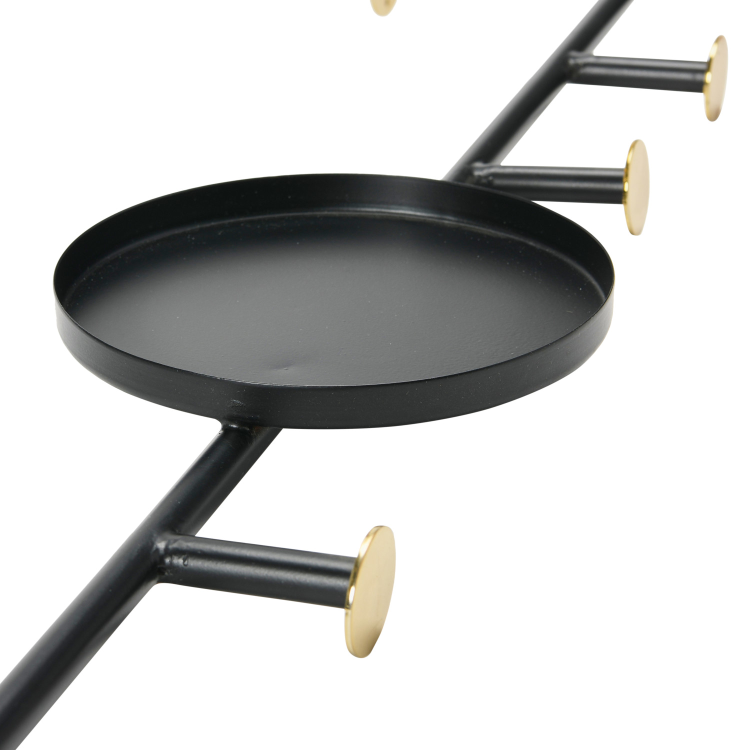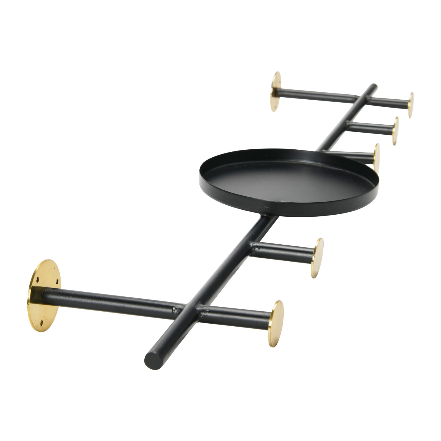 This artfully designed metal wall hook with matte black and brass finishes and one round shelf features five handy hooks. It will be a sleek and smart accent for a living room, den, office, or bedroom that works effortlessly with a wide range of styles. Additionally useful and attractive with scarves or jewelry displayed on the hooks.